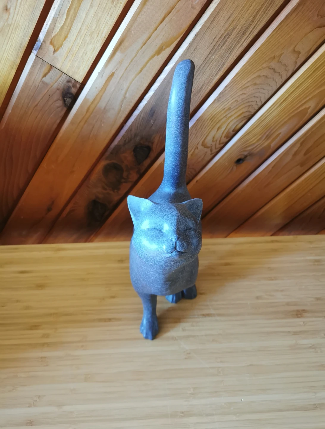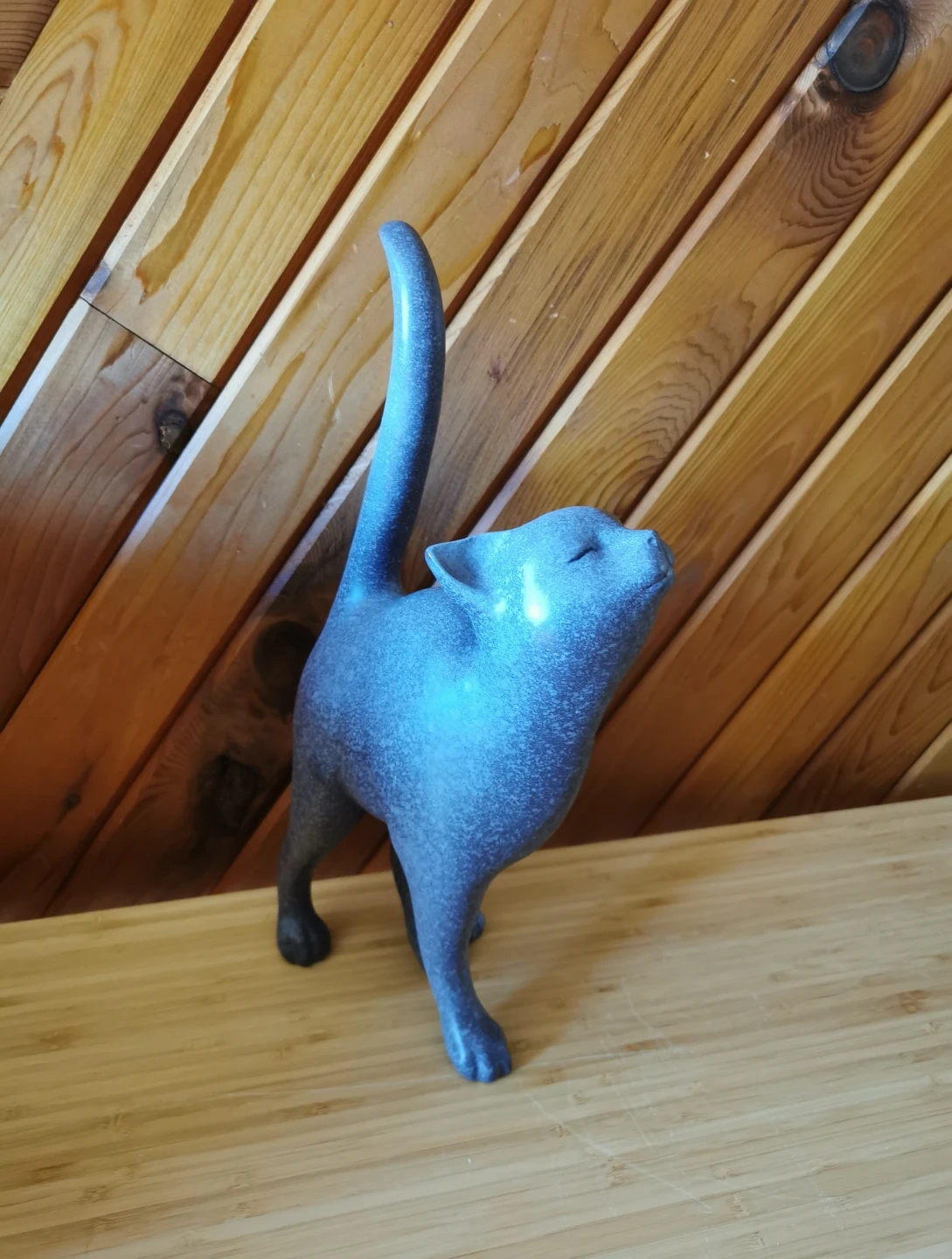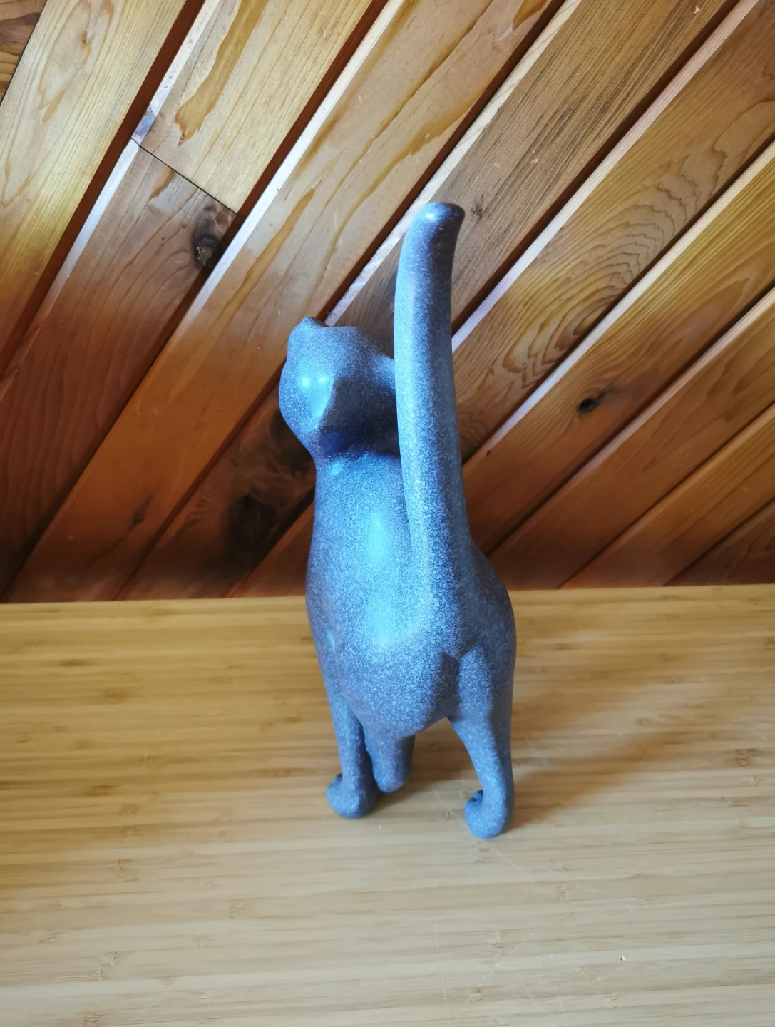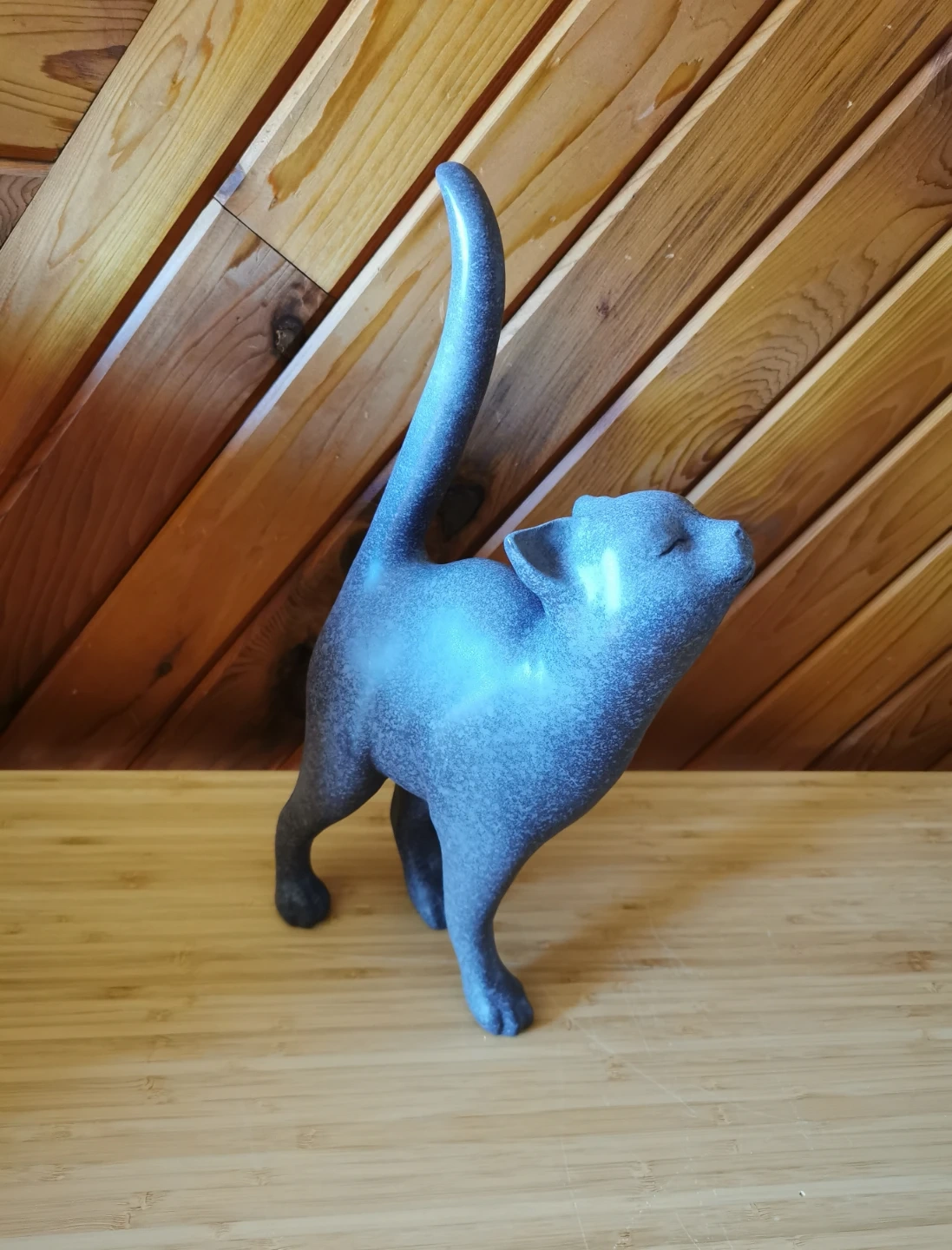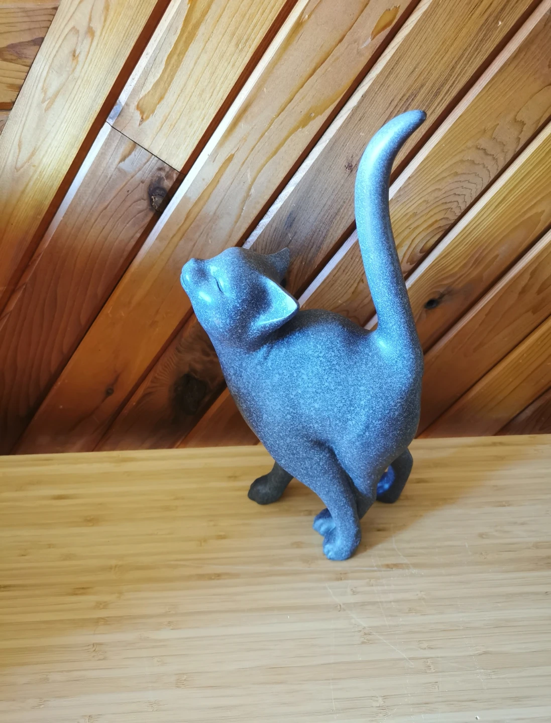 The design features a playful, upward-looking pose with elegant curves and a raised tail, giving it a whimsical yet stylish presence. The speckled blue-grey tone adds depth and makes it easy to blend with both modern and rustic interiors.