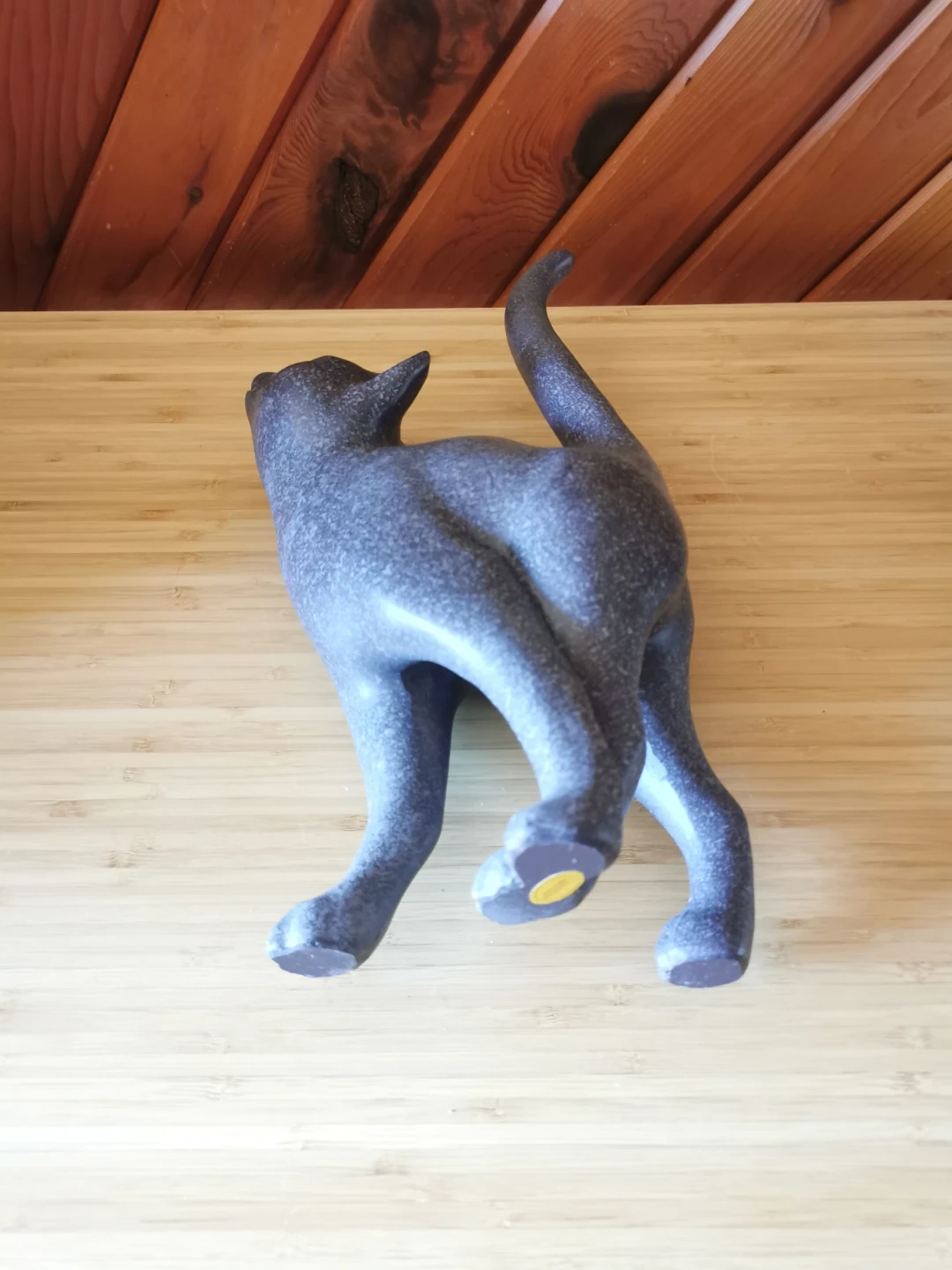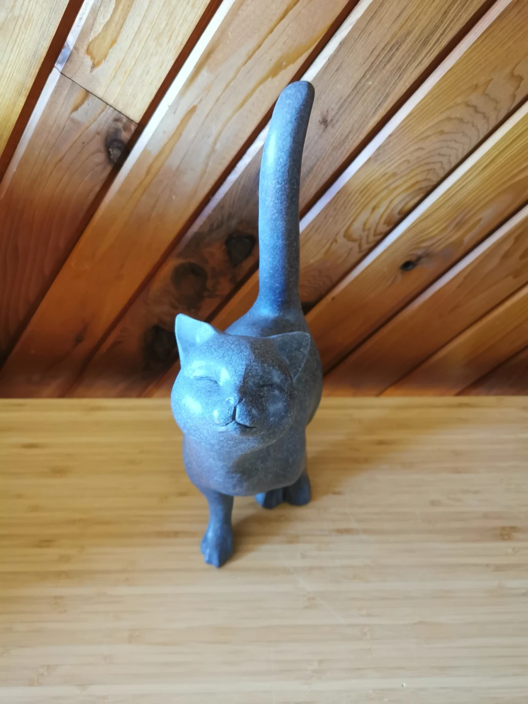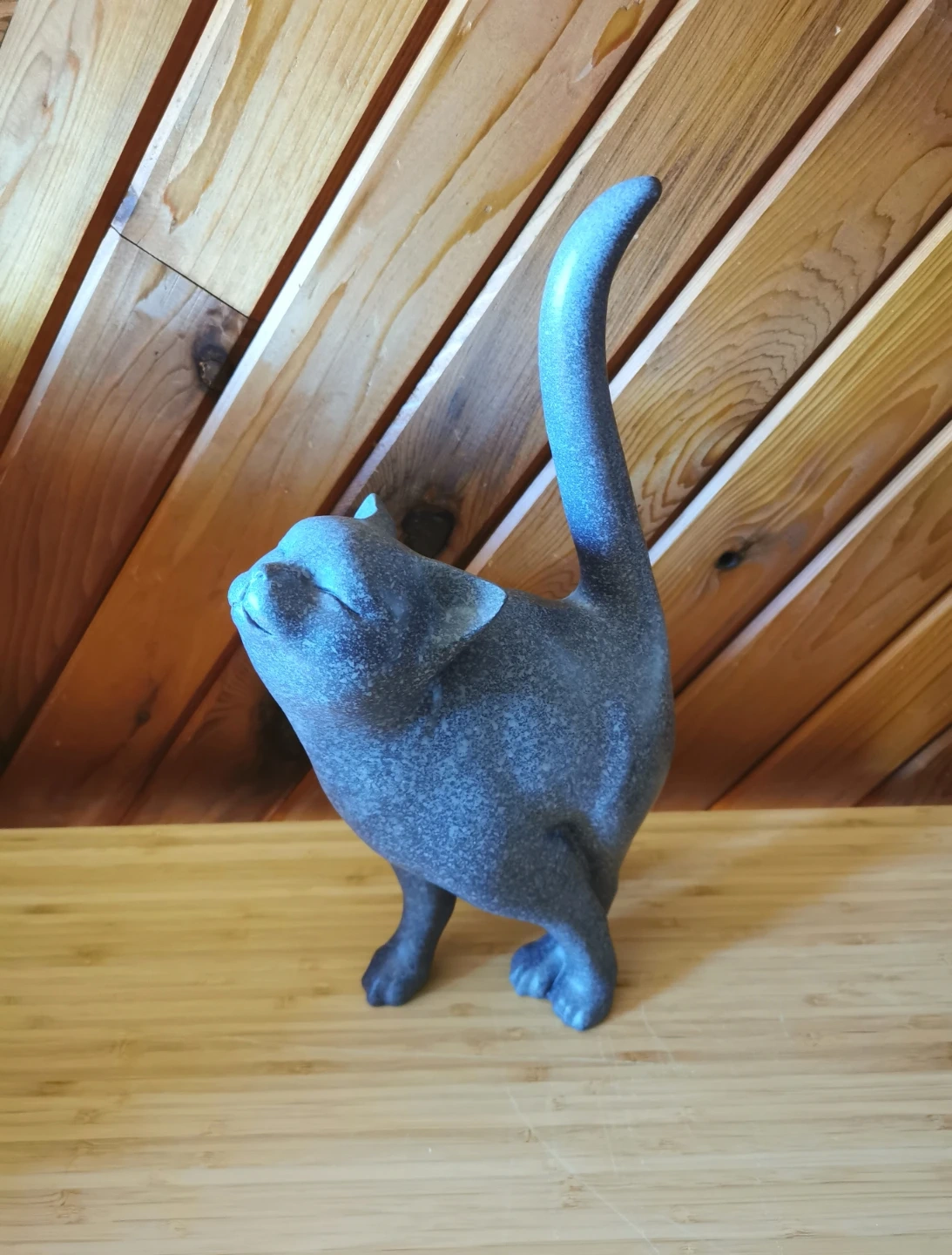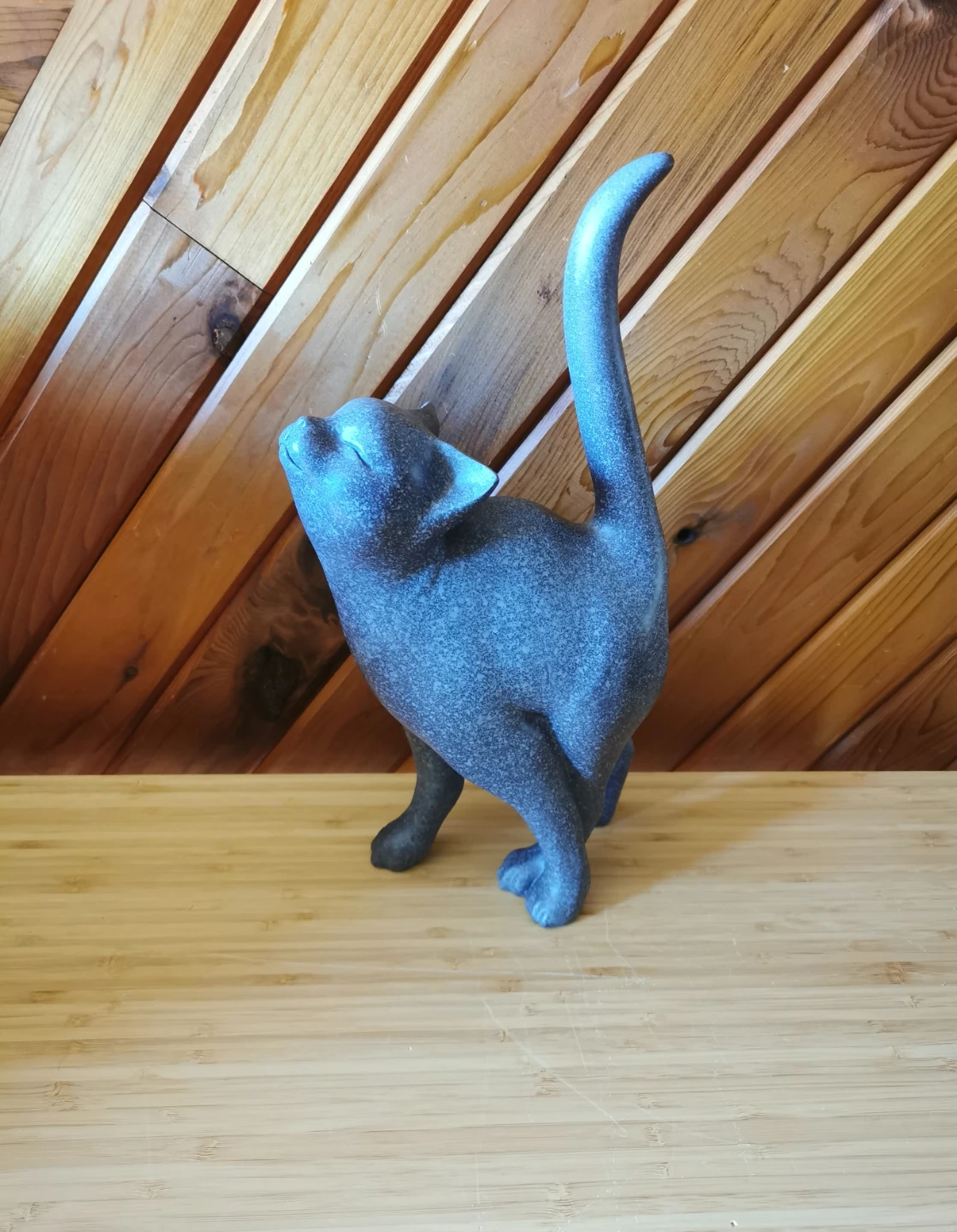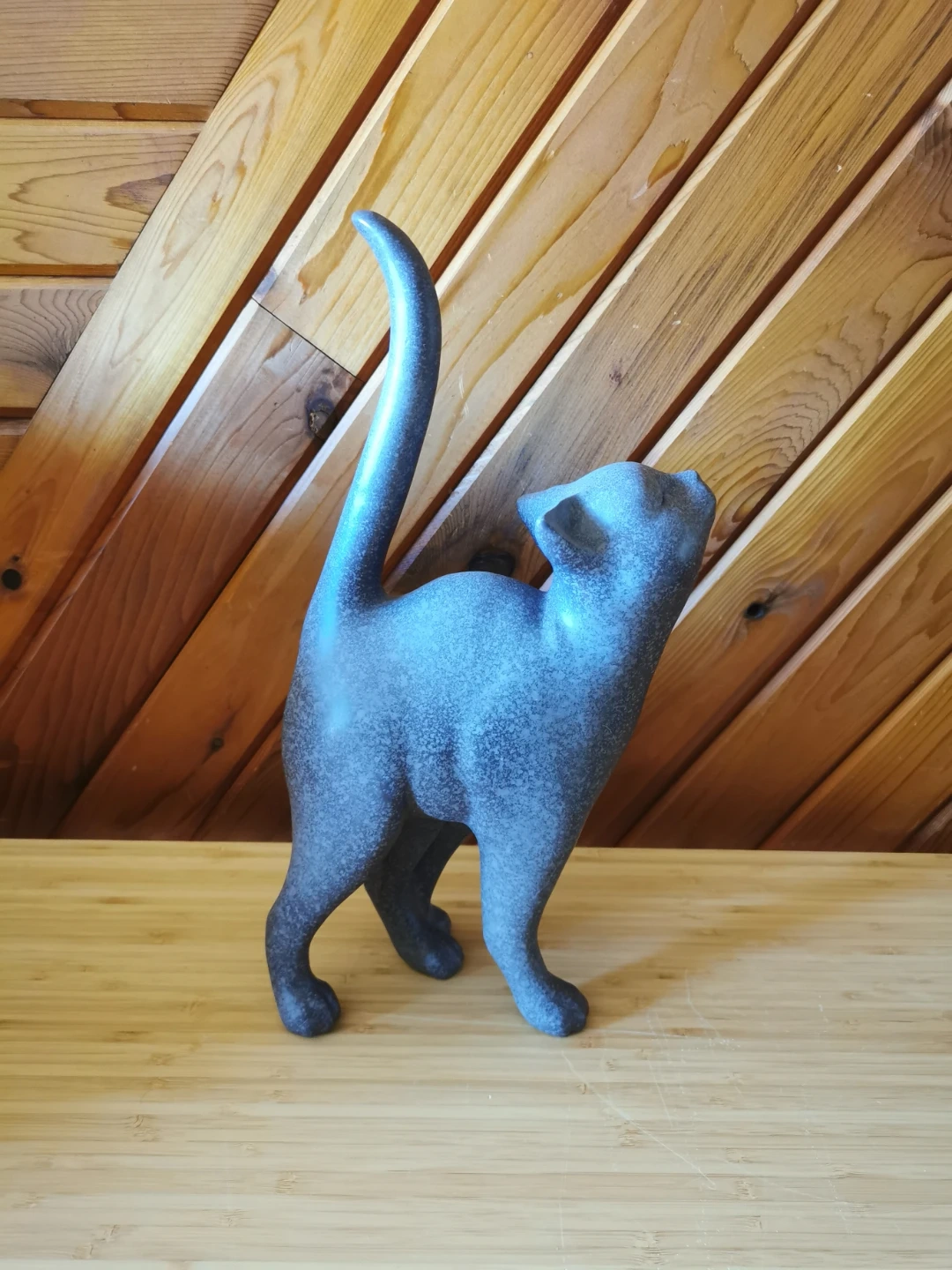 The design features a playful, upward-looking pose with elegant curves and a raised tail, giving it a whimsical yet stylish presence. The speckled blue-grey tone adds depth and makes it easy to blend with both modern and rustic interiors.