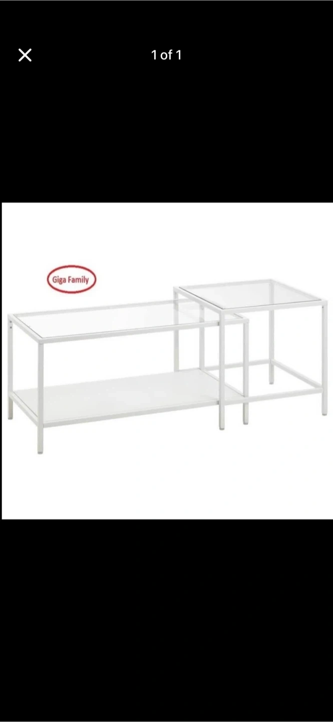 Selling a set of two coffee tables from Giga Family. These white tables feature a sleek, modern design with glass tops and a shelf on the larger table. Perfect for adding a touch of elegance to your living space!