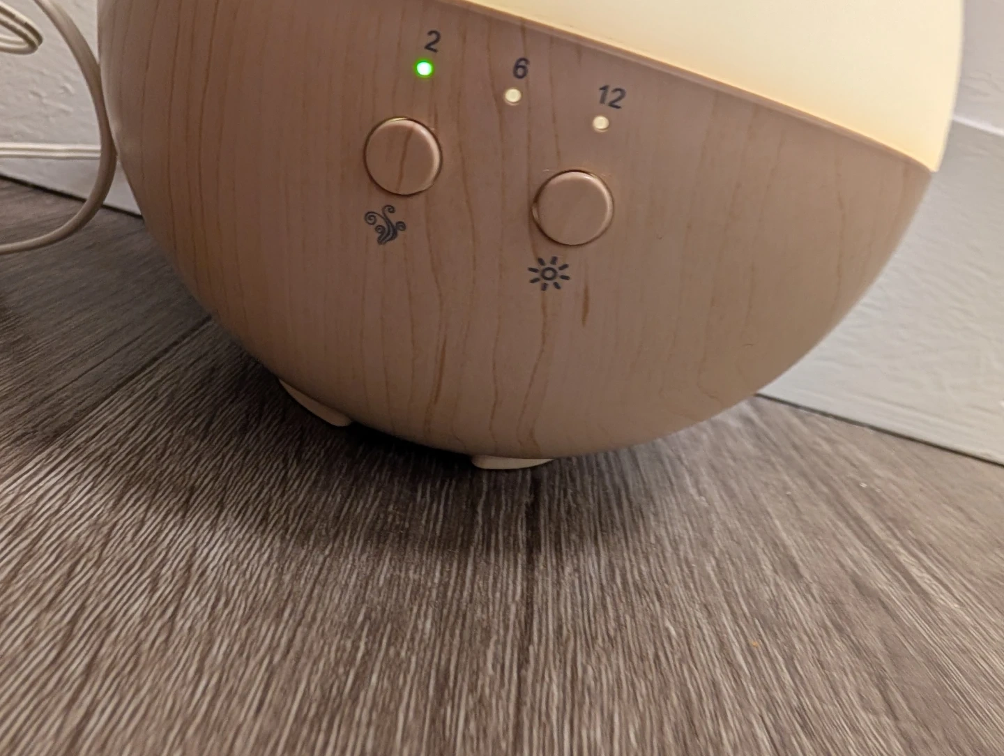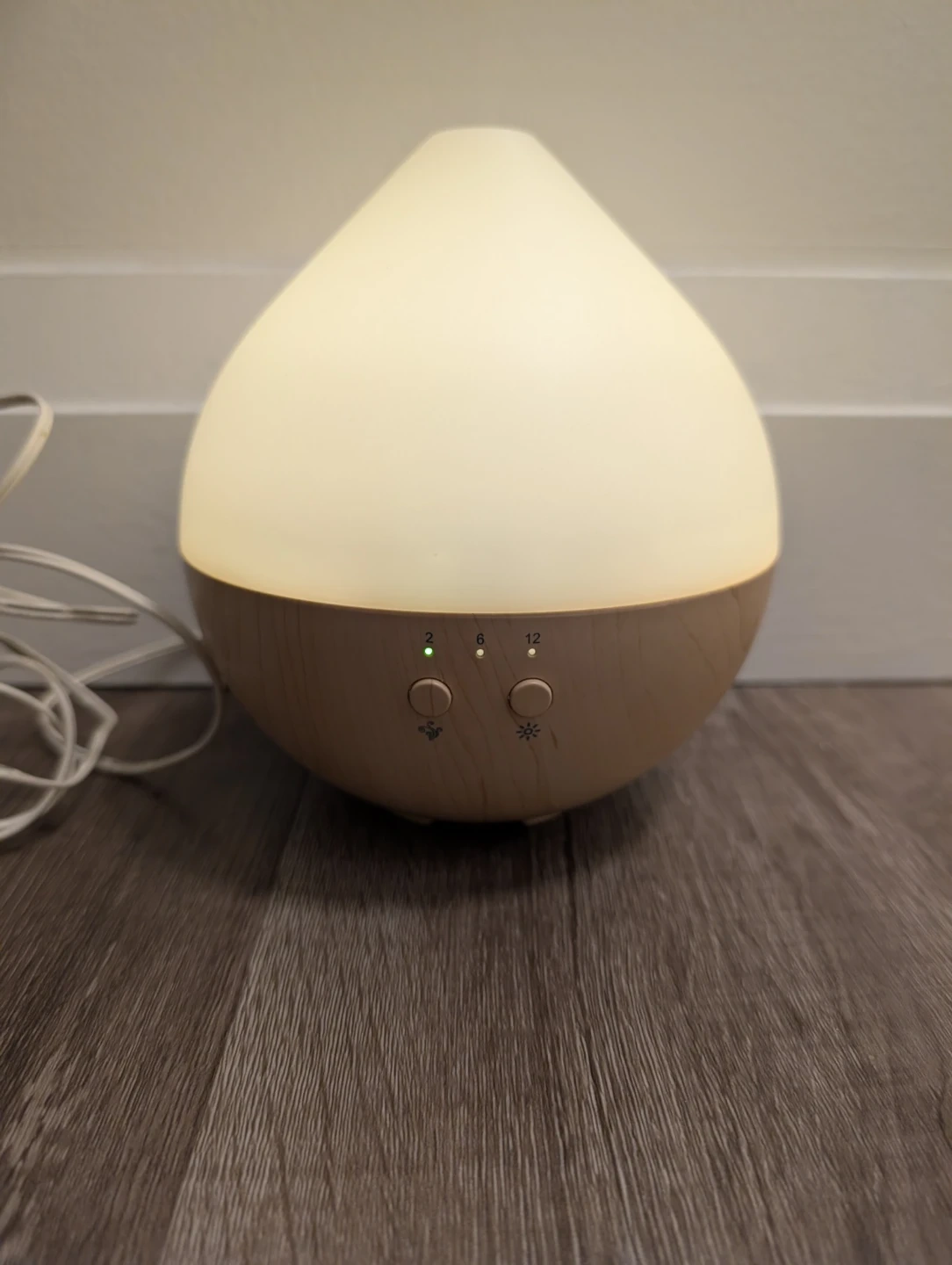 This essential oil diffuser has a large water tank for extended use. It features adjustable timer settings for 2, 6, or 12 hours. Emits a soft, warm light.