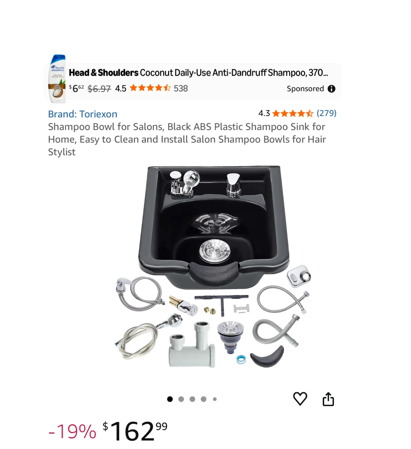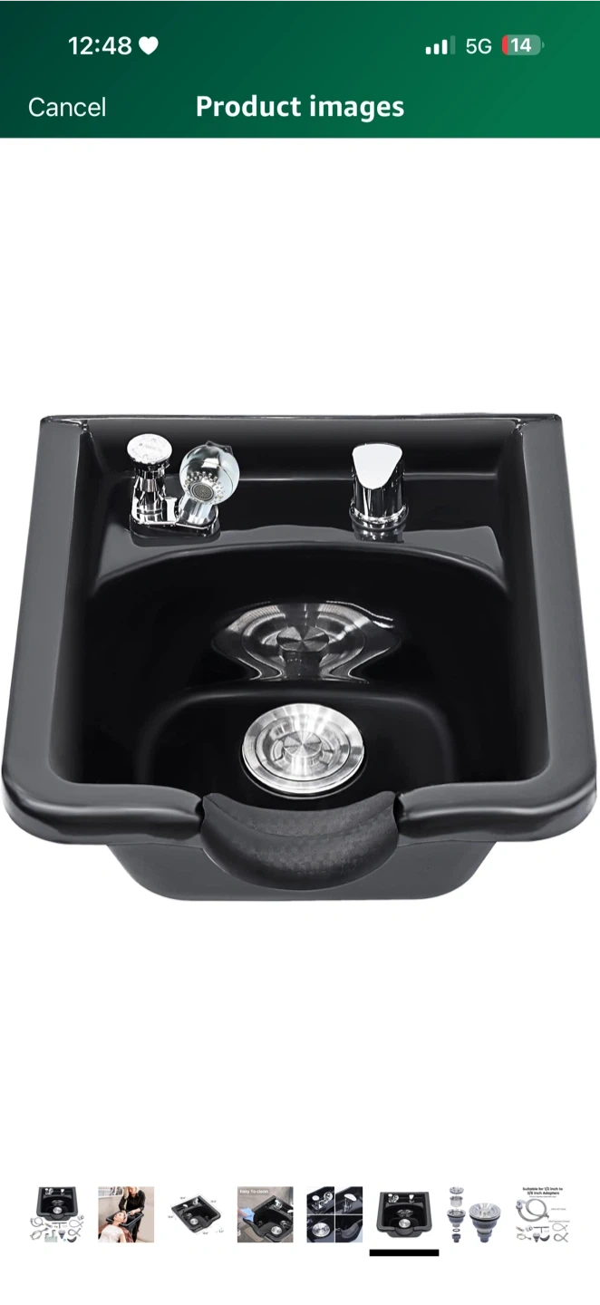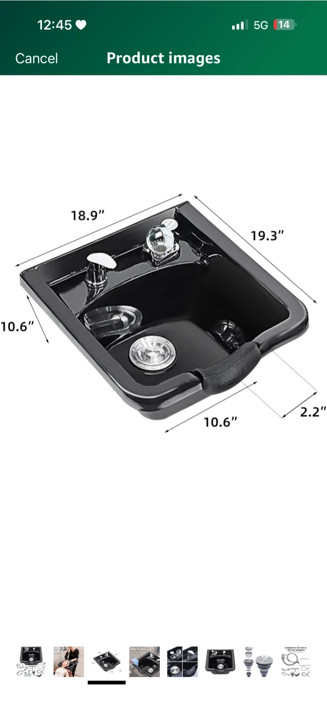 Selling a black salon shampoo bowl. It comes with all the necessary fixtures for installation. The dimensions are approximately 19.3" x 18.9" with a depth of 10.6".