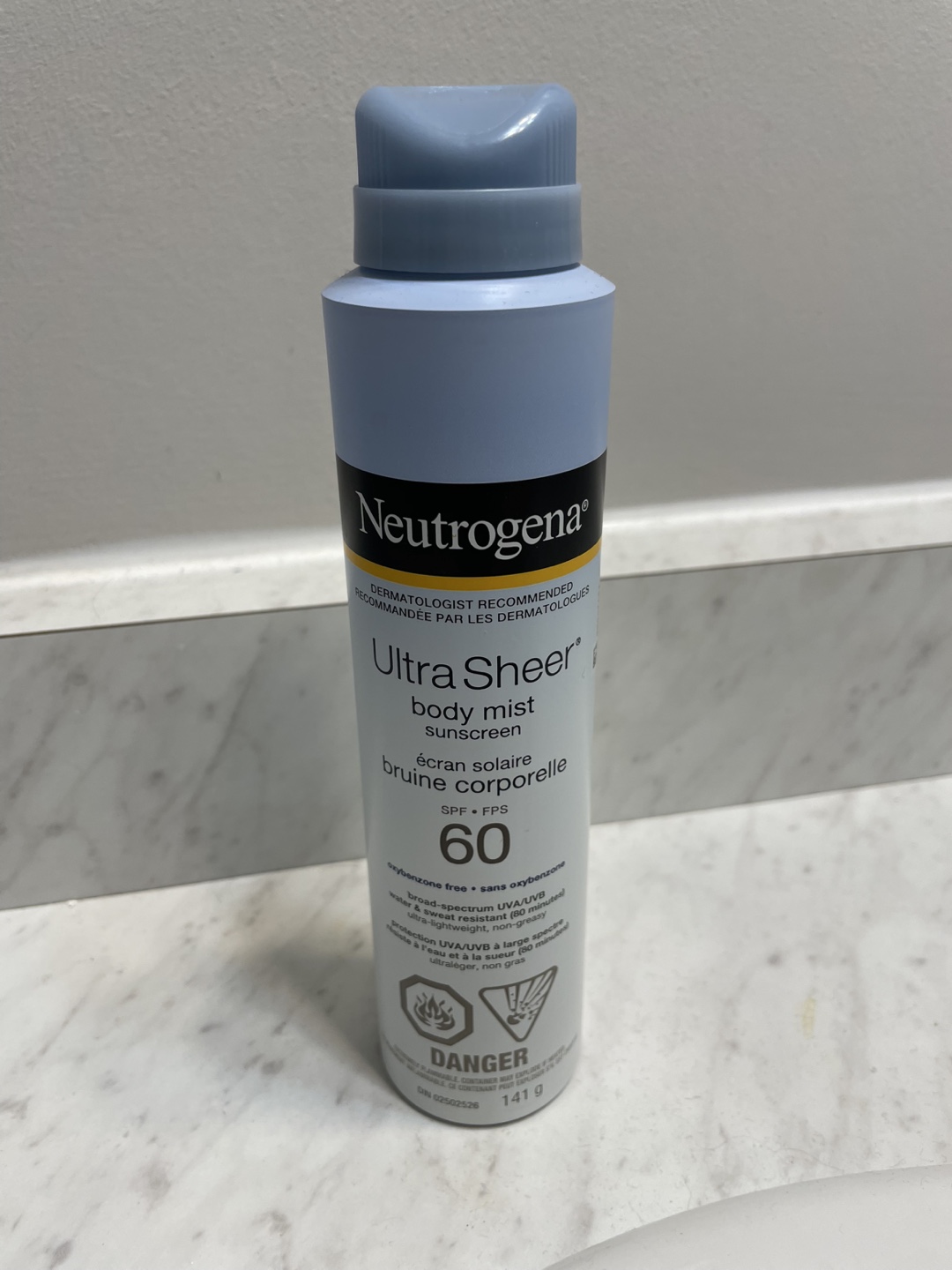 Neutrogena Ultra Sheer Body Mist Sunscreen in SPF 60. This sunscreen mist is dermatologist recommended. It's oxybenzone-free with broad spectrum UVA/UVB protection. Expiration date is 05/2026.