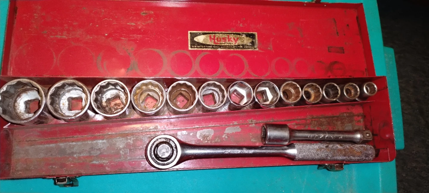 This is a Husky hand tools socket set. It includes a ratchet and various socket sizes. The set is housed in a red metal toolbox. Great for auto repairs or DIY projects! 1/2" drives 12-point socket