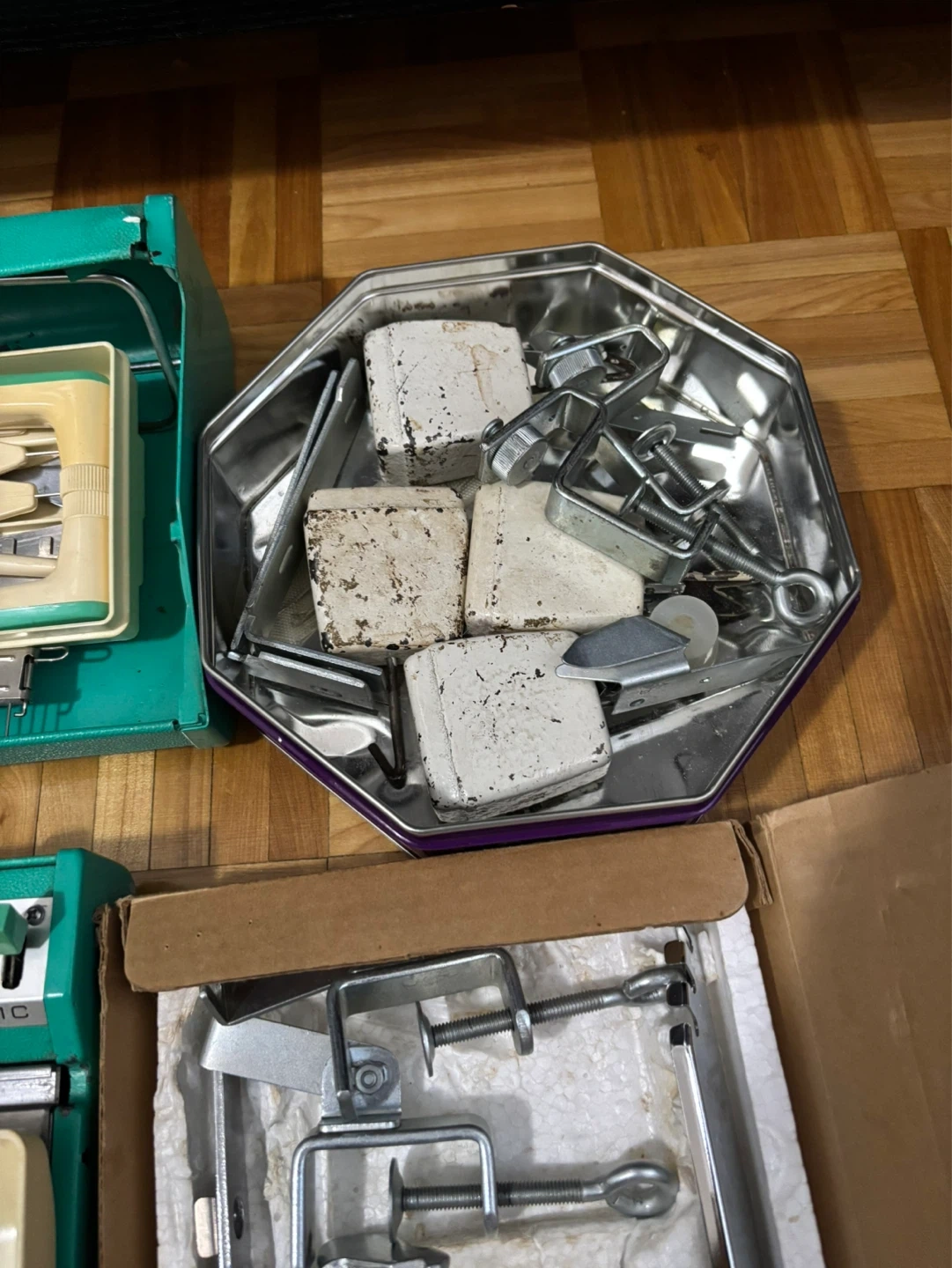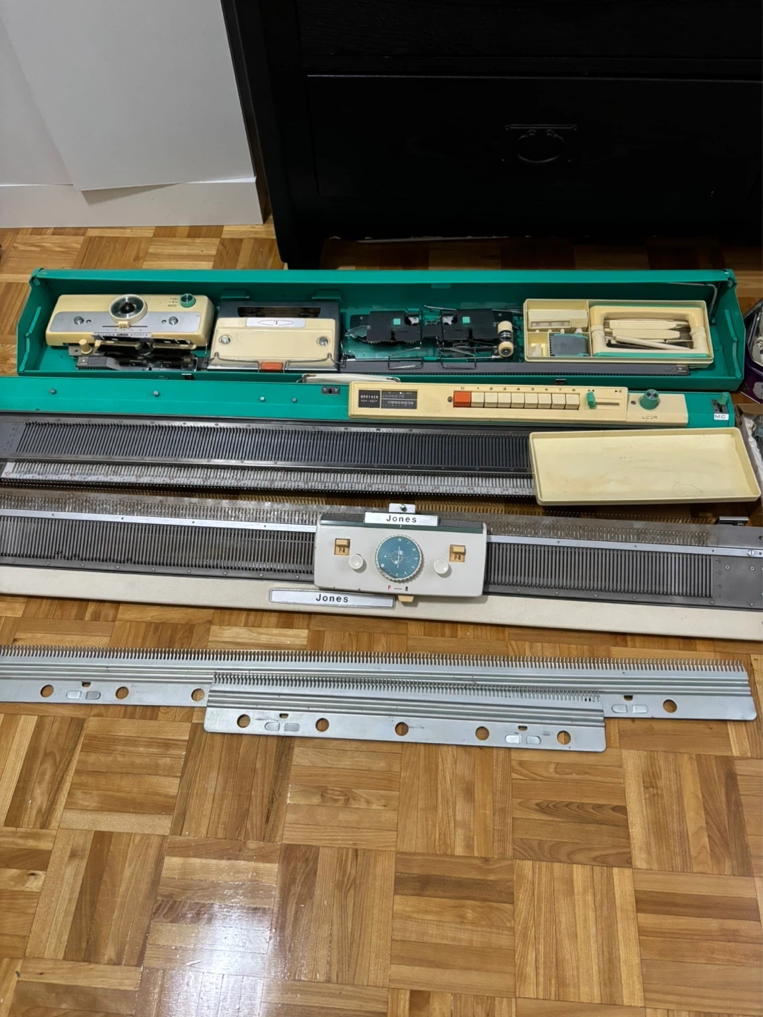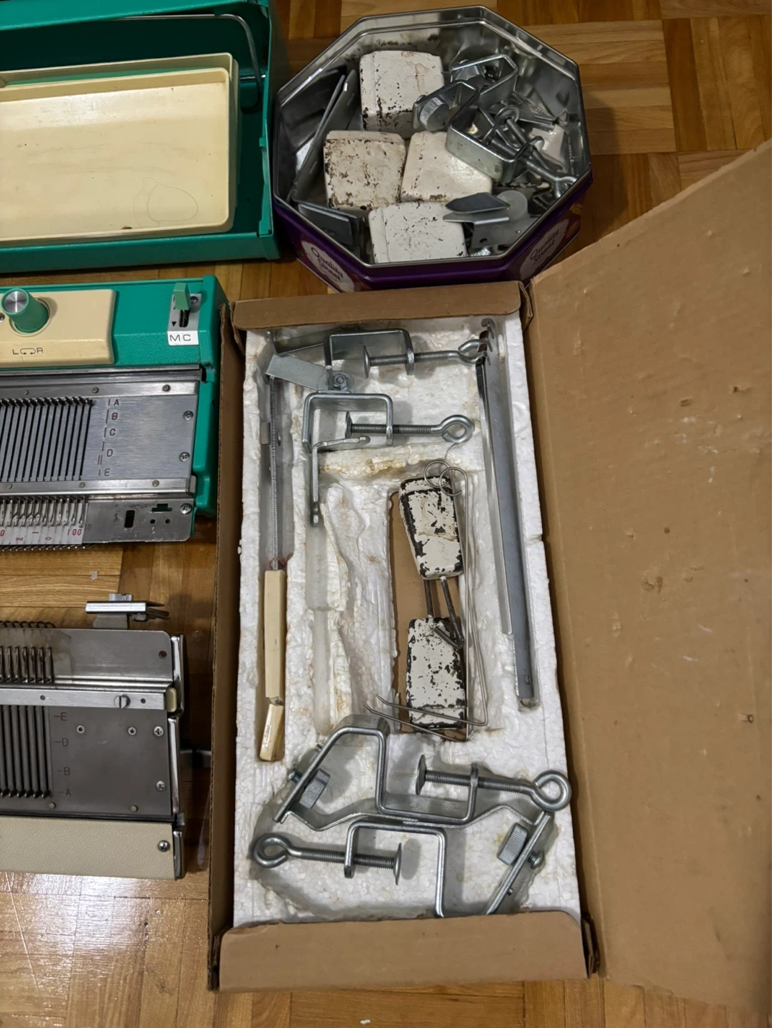 This listing includes a Brother knitting machine with various accessories, such as knitting pattern books and attachments like the KR-586 ribbing attachment. It also comes with a metal tin of clamps and a toolbox with additional metal components. The set includes multiple parts and manuals for different knitting functions.