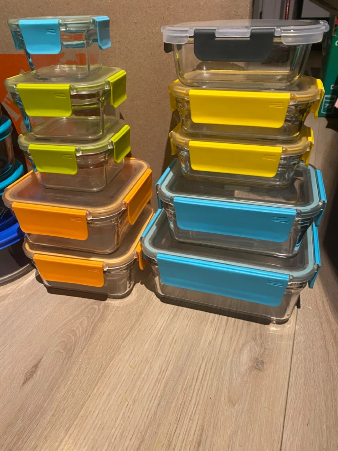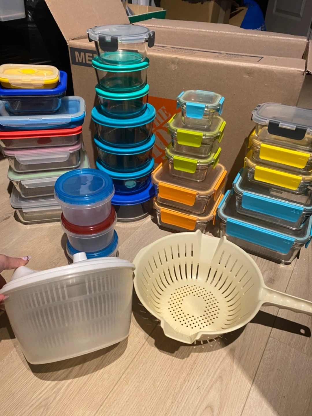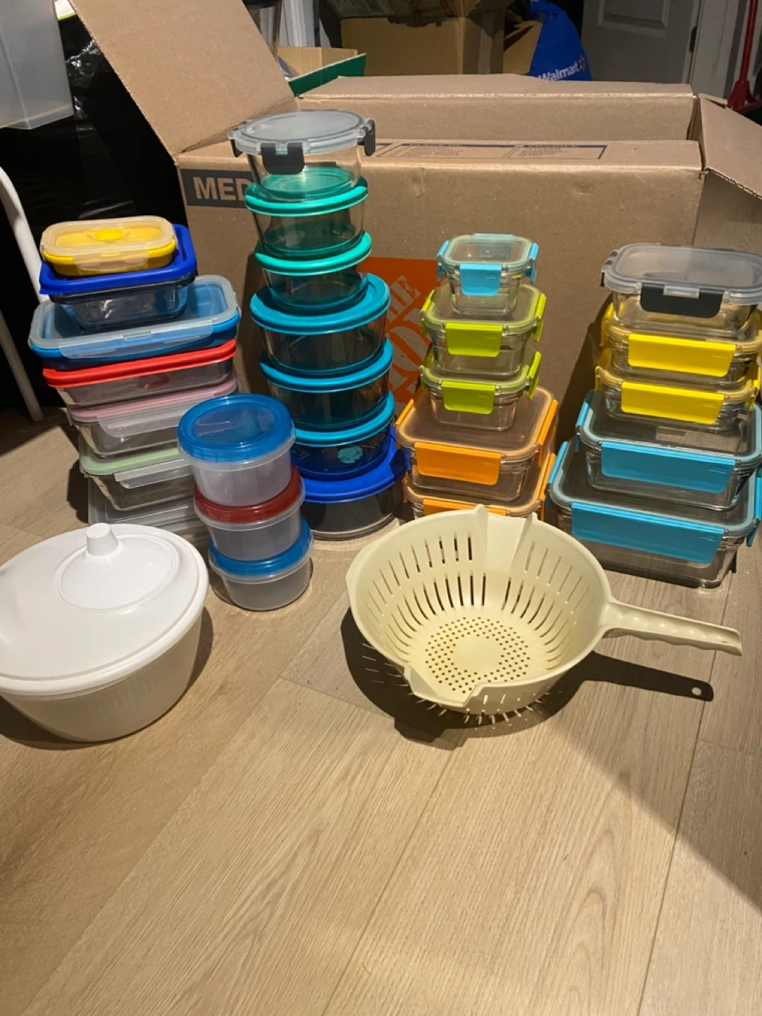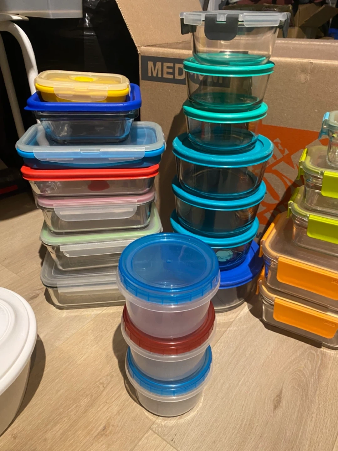 Large collection of food storage containers in various sizes and colours. Includes glass and plastic options with airtight lids. Great for meal prep and leftovers!