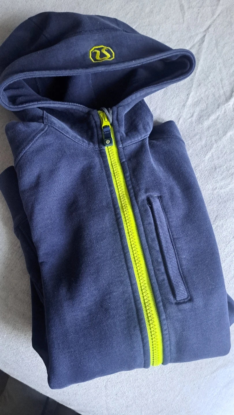A vintage Lululemon full zip hoodie in navy. It's made with a soft fabric and features a bright yellow zipper. This hoodie has a comfortable slim, size small fit and includes pockets.