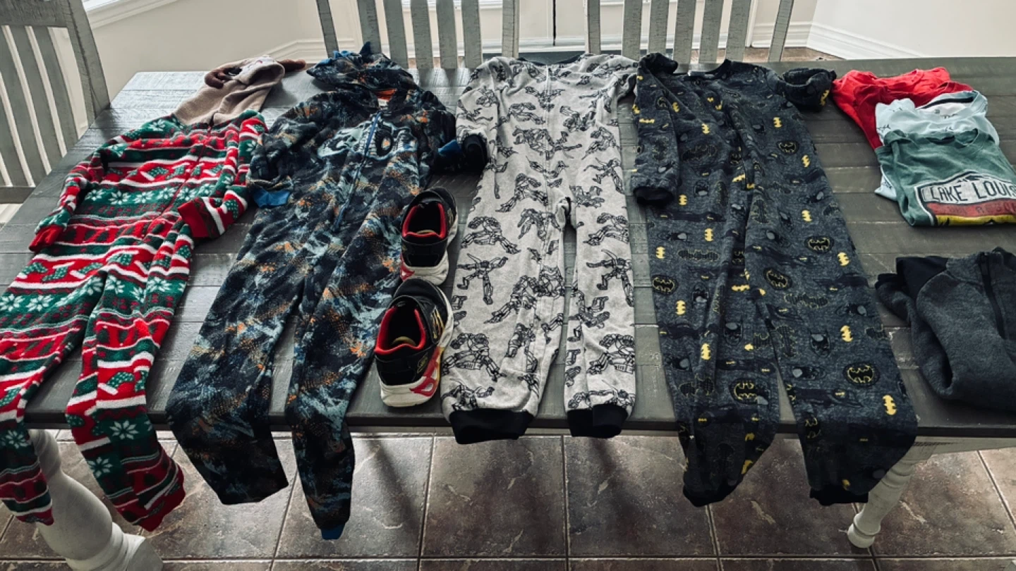 4 full size onesies, Skechers running shoes. Not sure if the size but my 8 year old grandson wore them, 4 T shirts, 1 long sleeved sweater and 1 dress up black shirt. All in great clams clean