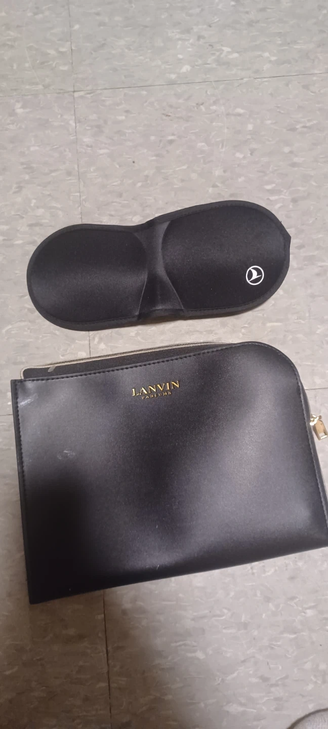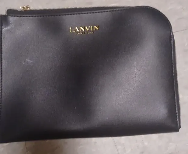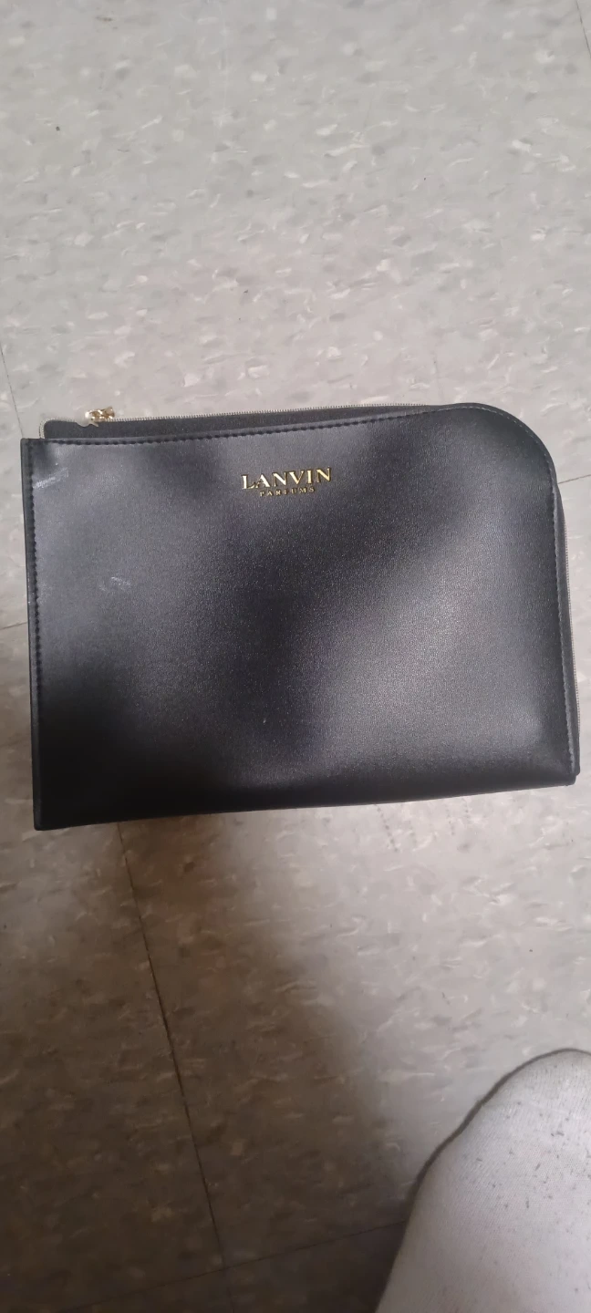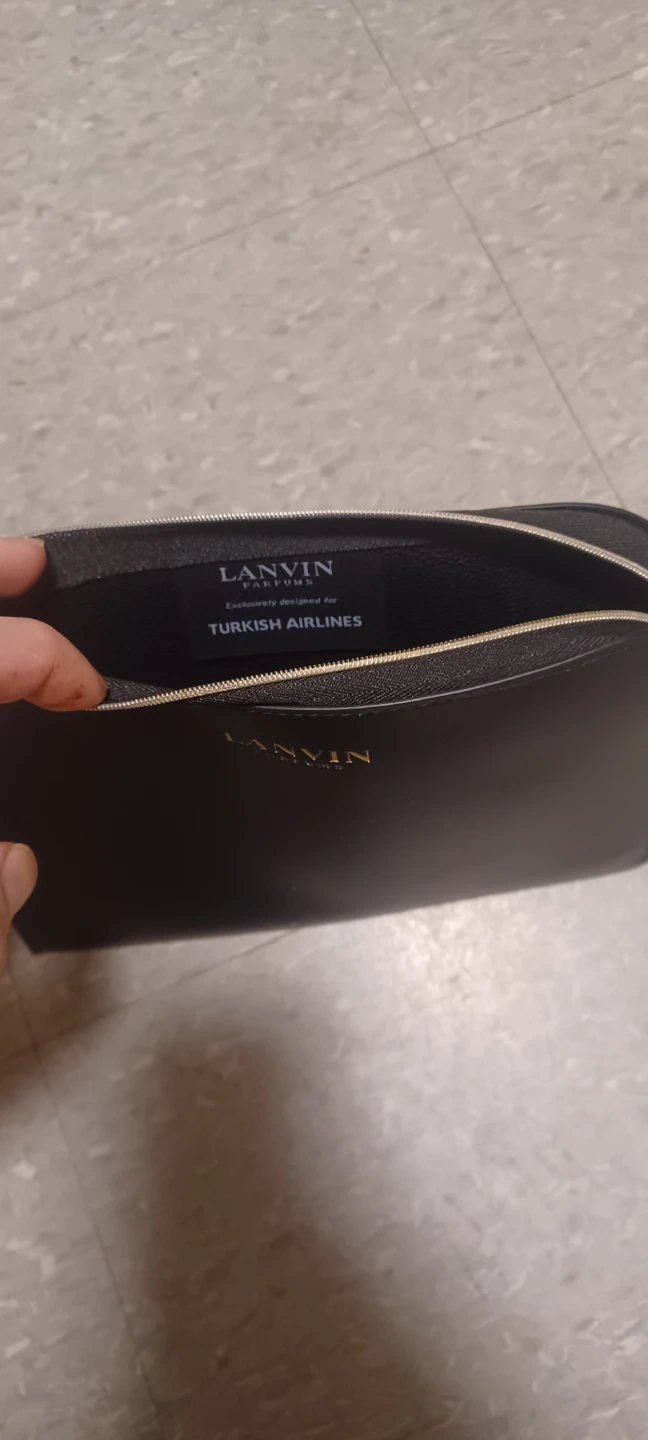 Here is a black pouch from LANVIN Paris. It has a zipper closure and a brown accent on the back. Inside, there's a tag that says "LANVIN PARFUMS" and "Exclusively made for TURKISH AIRLINES".