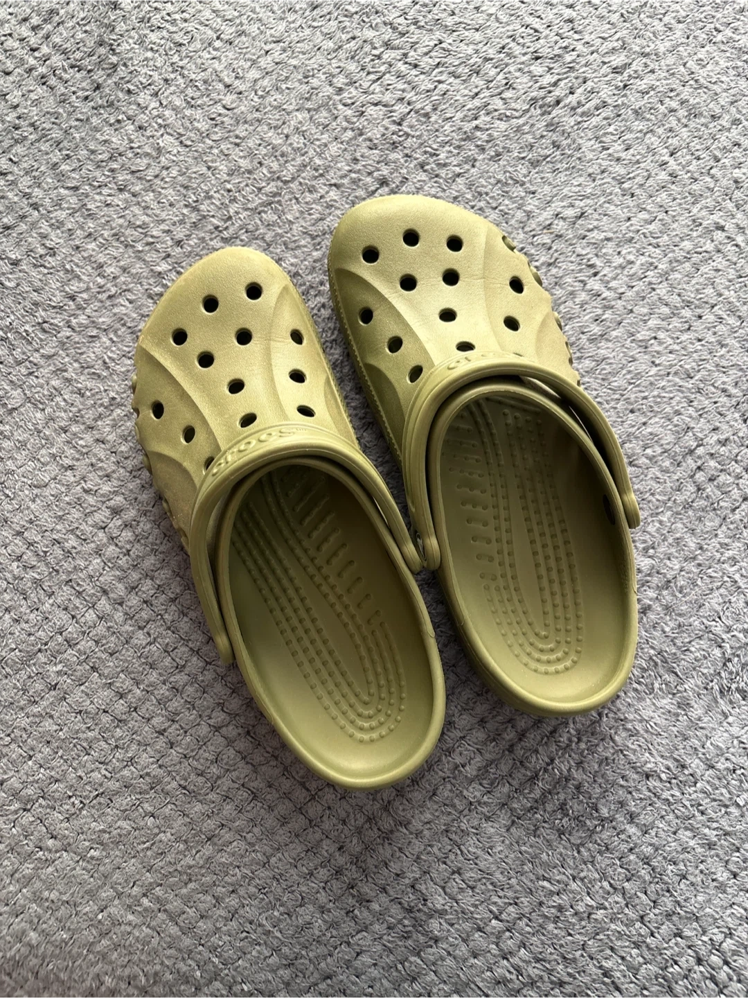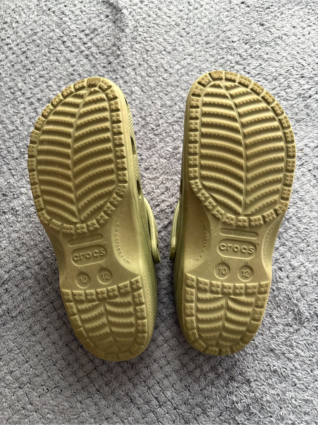Genuine Classic Crocs clogs in a pale green colour. Size is 10M, 12W. They're made of a foam-like Croslite material. Easy to clean and waterproof!