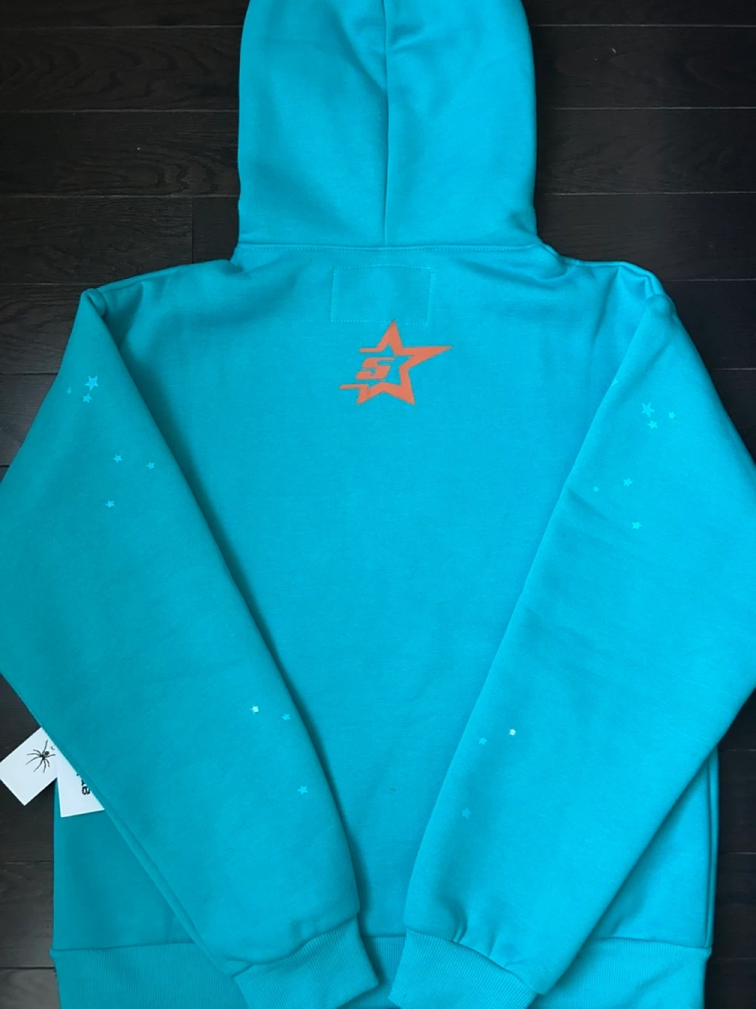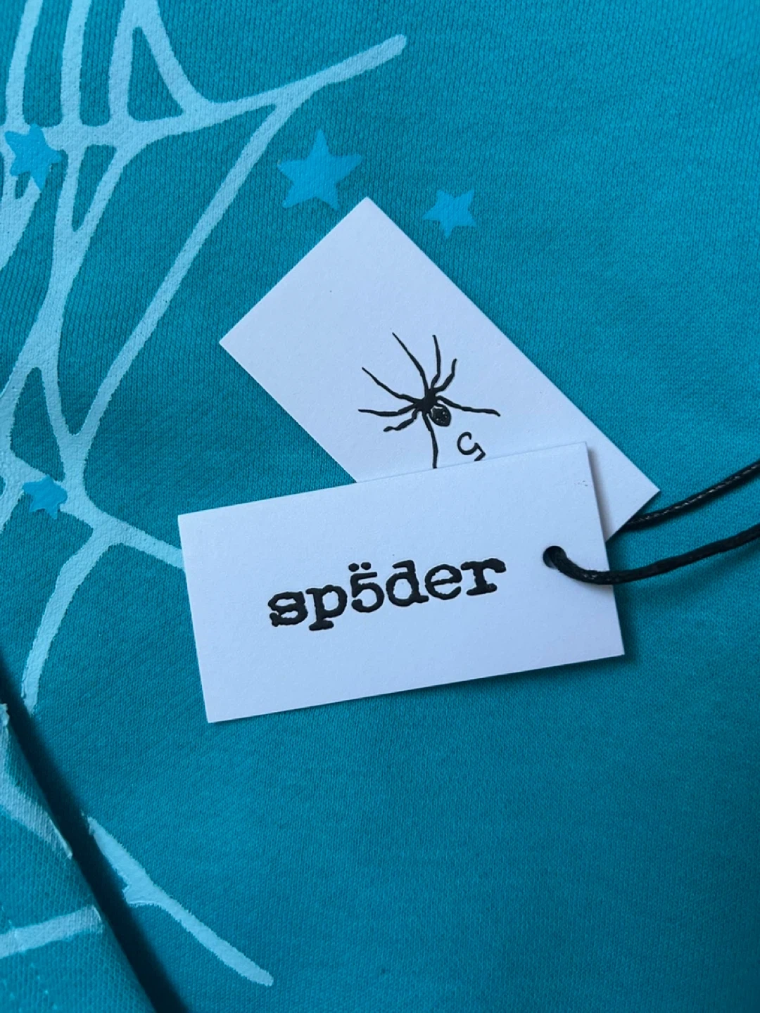 This is a Spider Clothing hoodie in a bright teal colour. It has a large web graphic on the front with the "Spider!" logo. The hoodie also has star details on the sleeves and a star graphic on the back. Size is small.