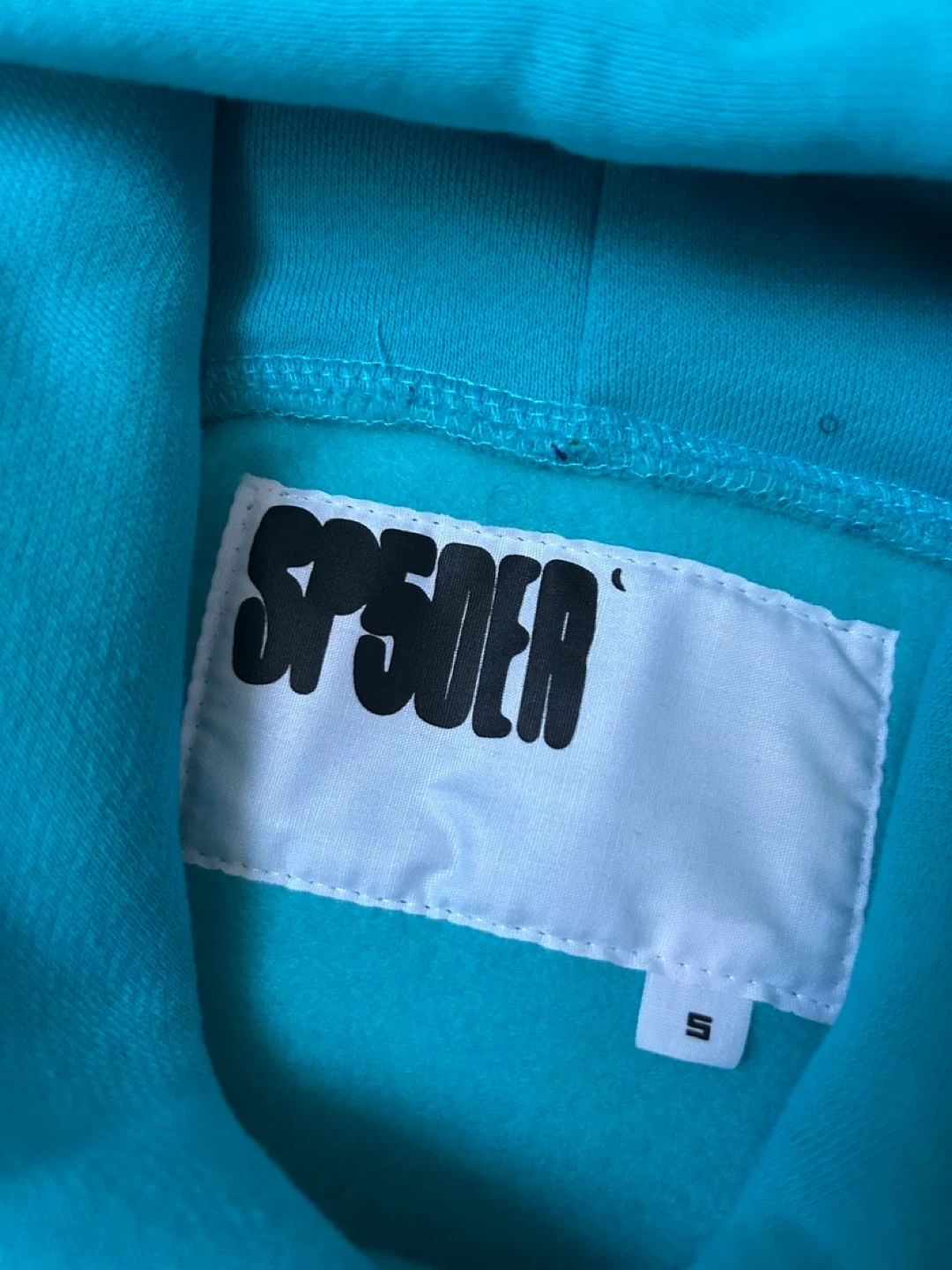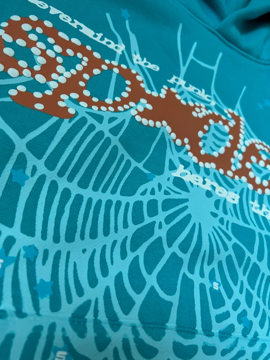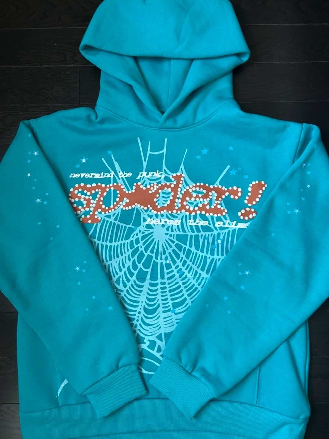 This is a Spider Clothing hoodie in a bright teal colour. It has a large web graphic on the front with the "Spider!" logo. The hoodie also has star details on the sleeves and a star graphic on the back. Size is small.