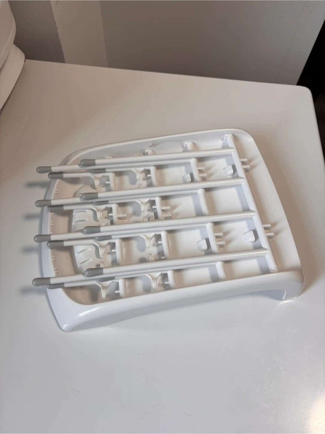 White and gray baby bottle drying rack. It's designed to hold multiple bottles and accessories. The tray collects excess water.
