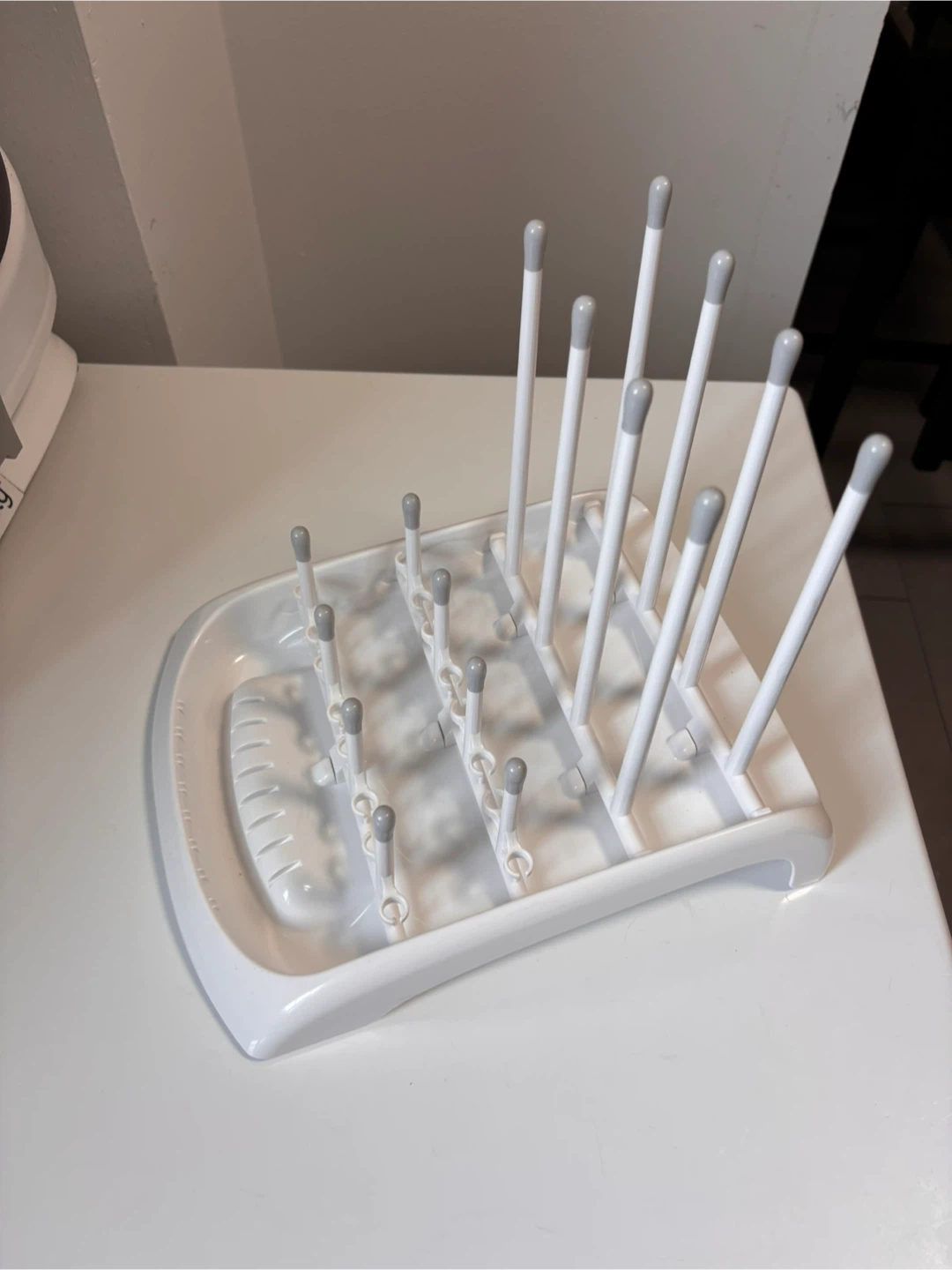 White and gray baby bottle drying rack. It's designed to hold multiple bottles and accessories. The tray collects excess water.