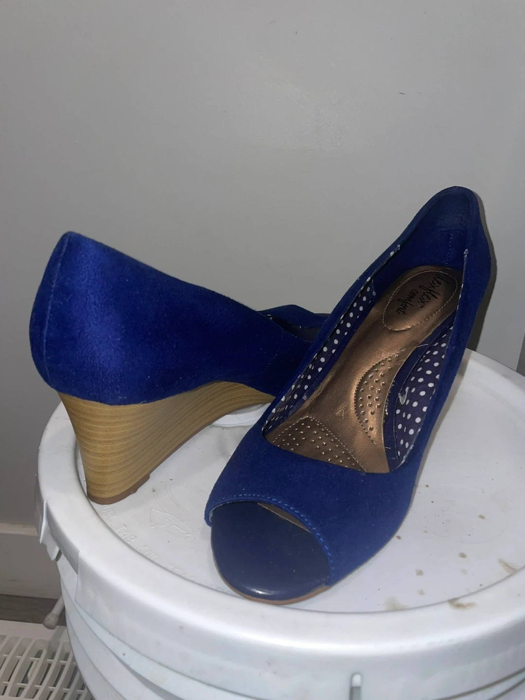 These blue wedge heels feature a peep-toe design. The inside lining has a polka dot pattern. The wedge heel is made of a wood-like material. They're comfy and stylish!