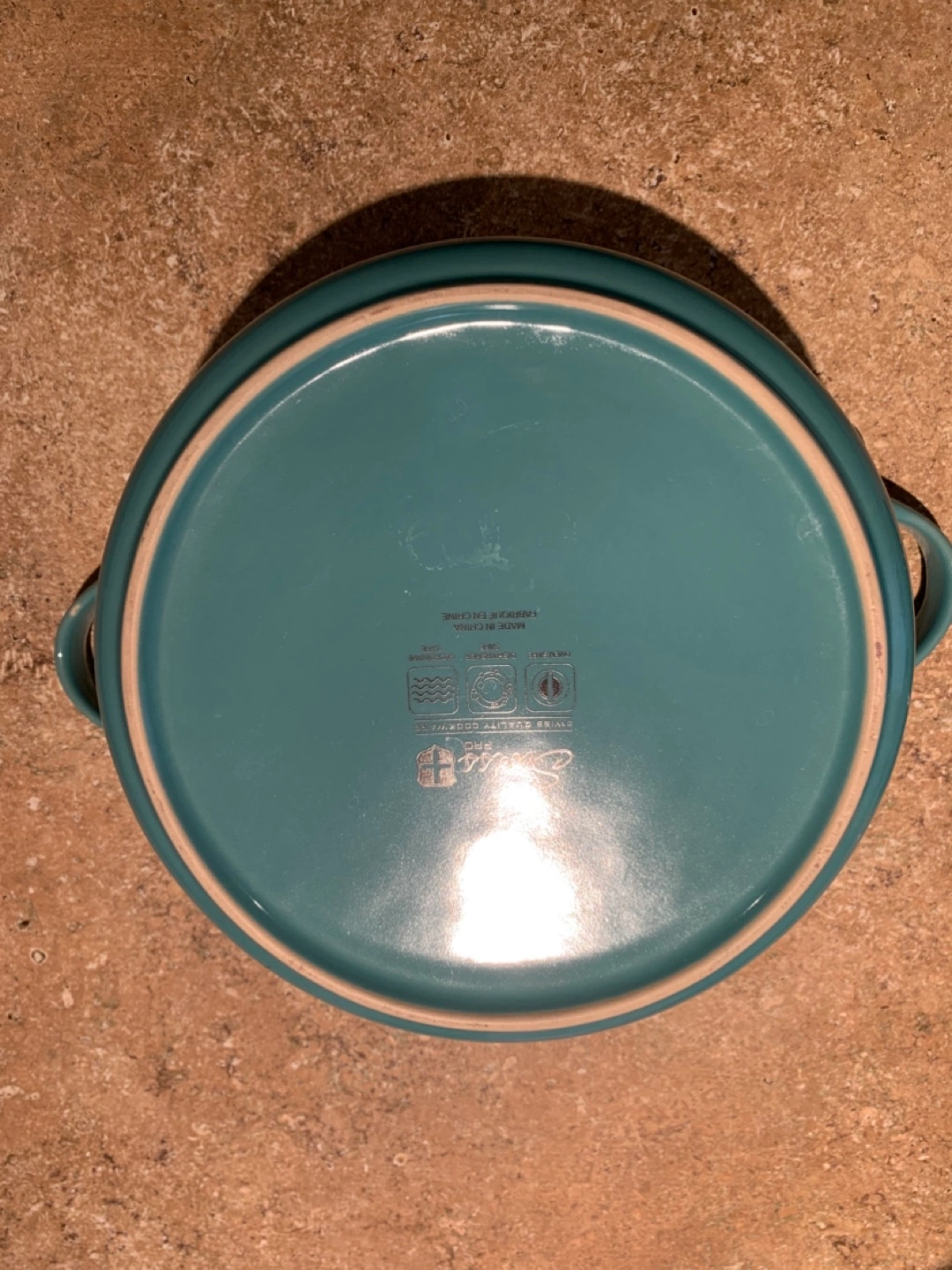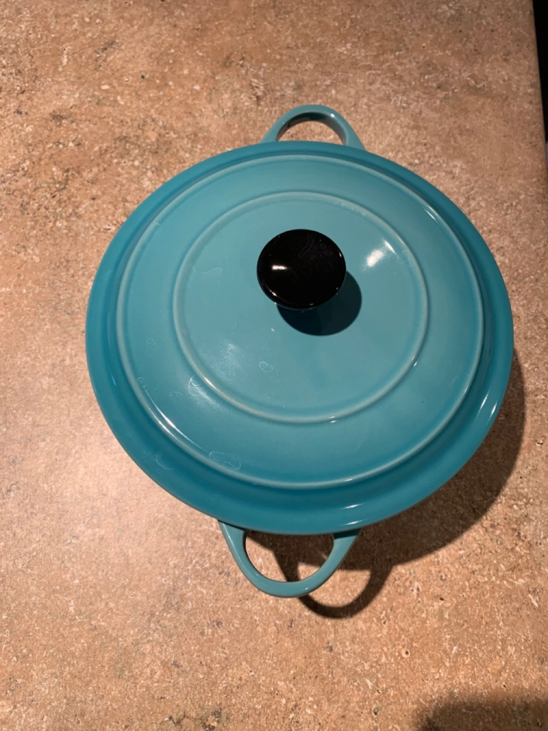 Beautiful teal Le Creuset casserole dish. Round shape, 20cm. Oven-safe. Includes lid. Minor wear.