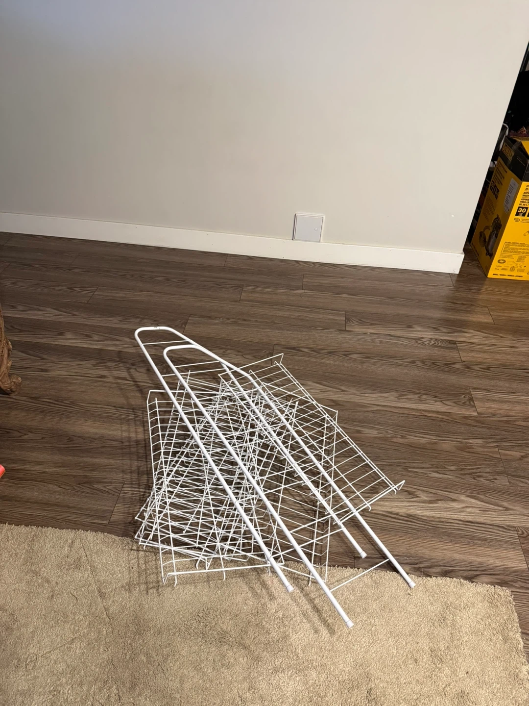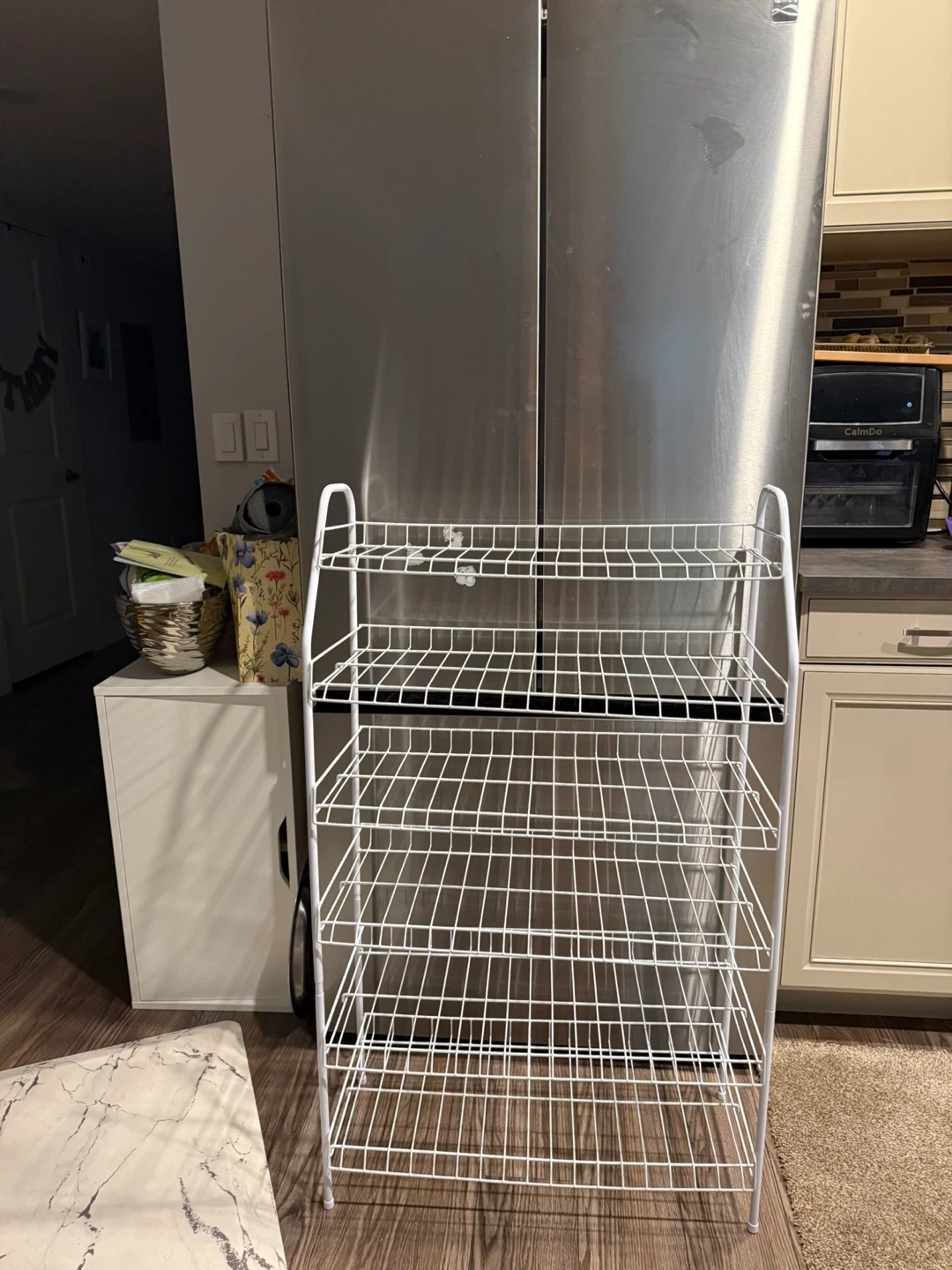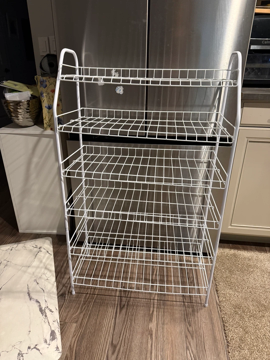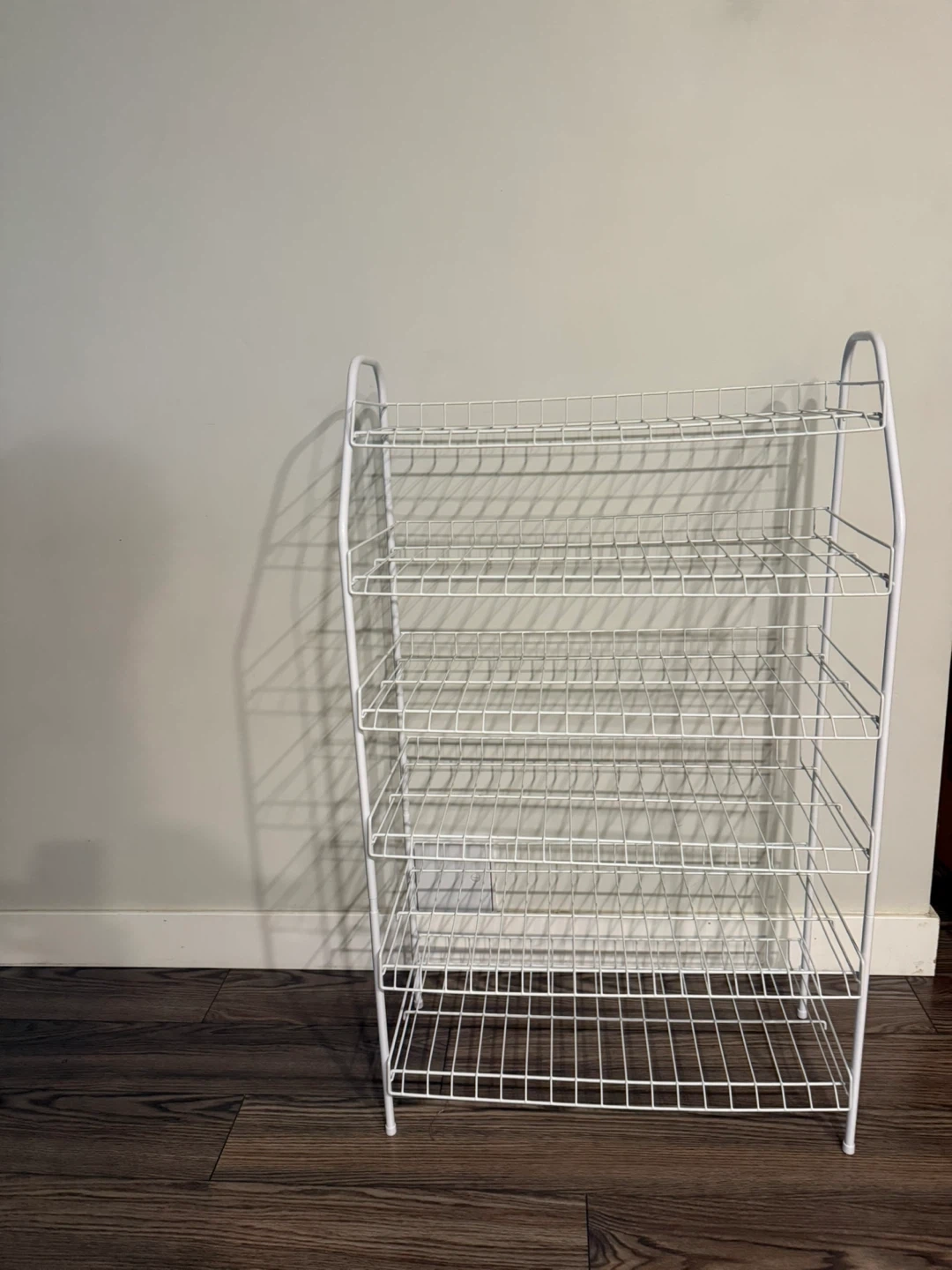 This is a white 5-tier wire shelving unit. It's great for organizing shoes, storage bins, or other household items. The wire construction allows for good ventilation.