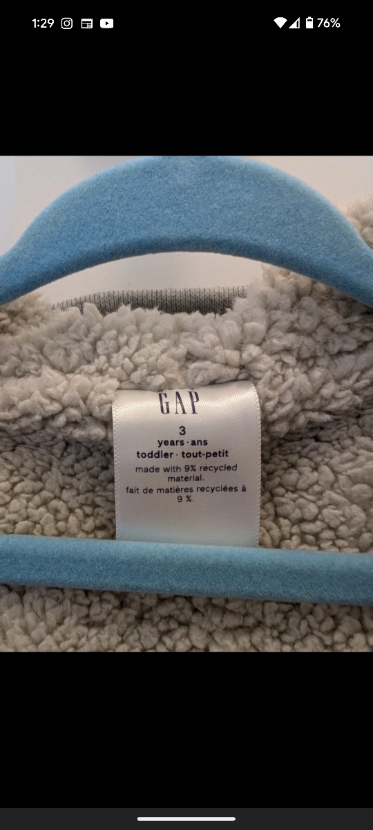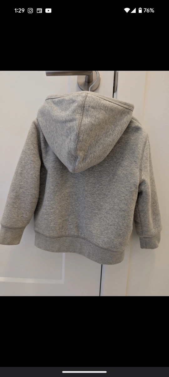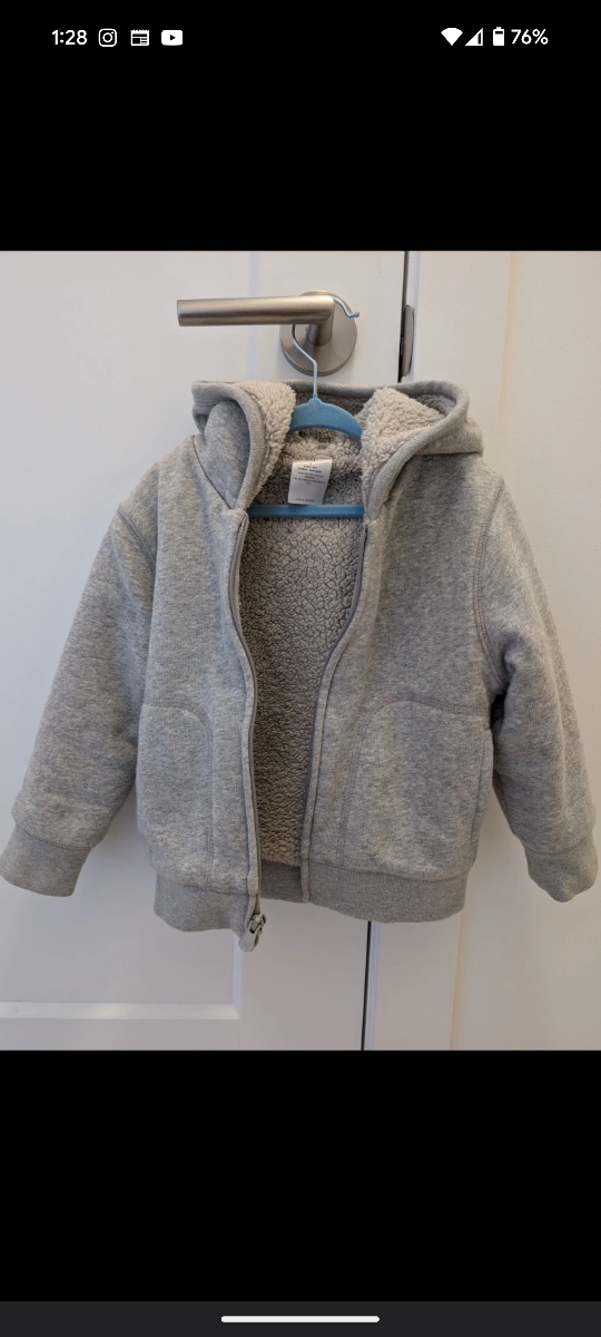 Grey zip-up hoodie with pockets. Soft sherpa lining. Size 3 toddler. Great for colder weather. Recycled materials. In good condition. Smoke and pet free home.