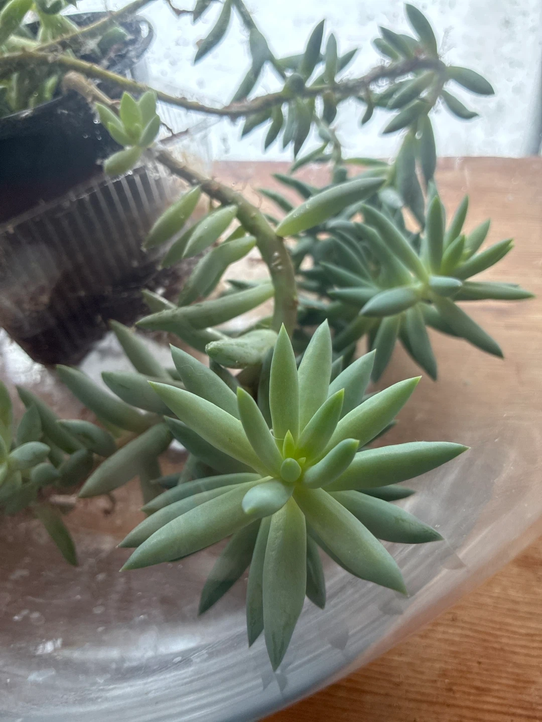 A lovely succulent plant with fleshy, pale green leaves. It's in a small pot and ready for a new home. This plant thrives in bright light. One cutting about 1-2β long stem. No pots provided.