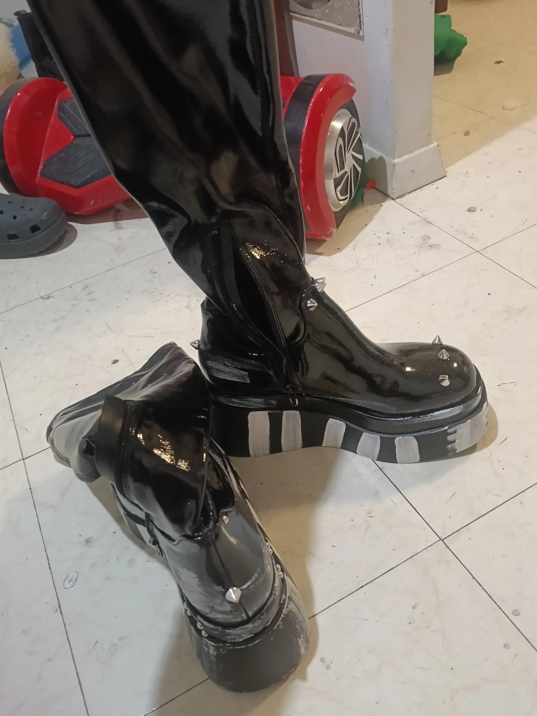 Shiny black platform boots with spiked details. These boots have a chunky sole and a side zipper. They look like they'd be fun for a night out! size 7.5