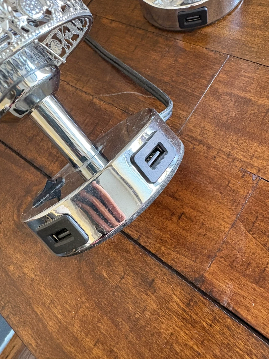 Each lamp has 2 charging ports - 4 in total and all of them work (I’ve tested them). On/Off switch on the base and on the cord. Nice long cords also.