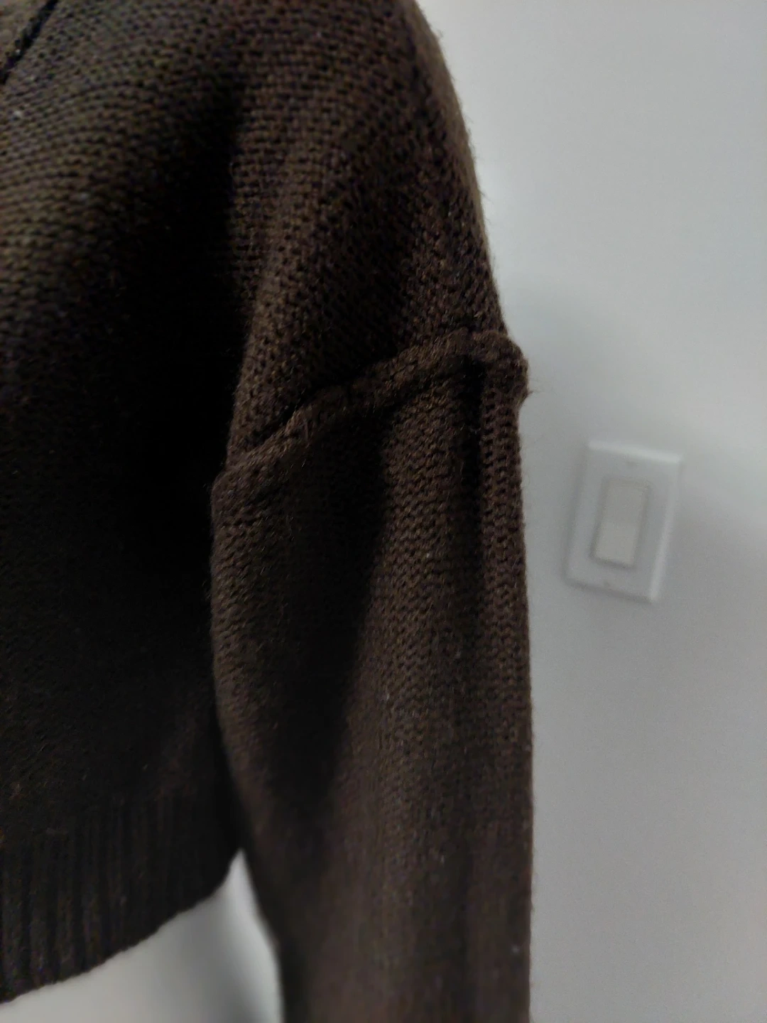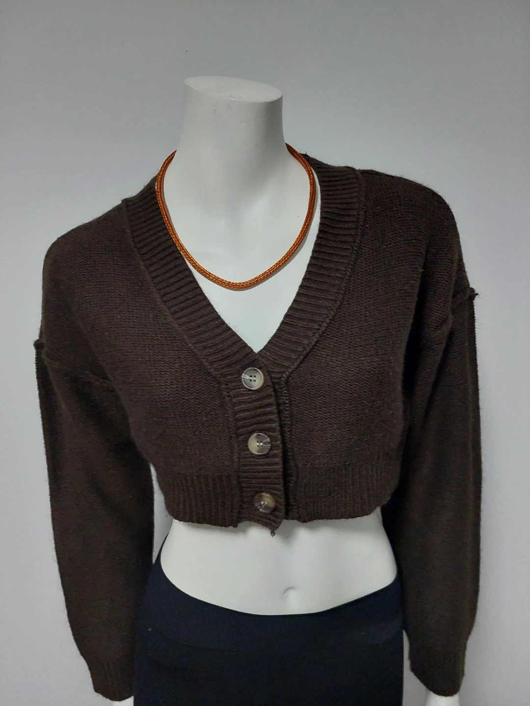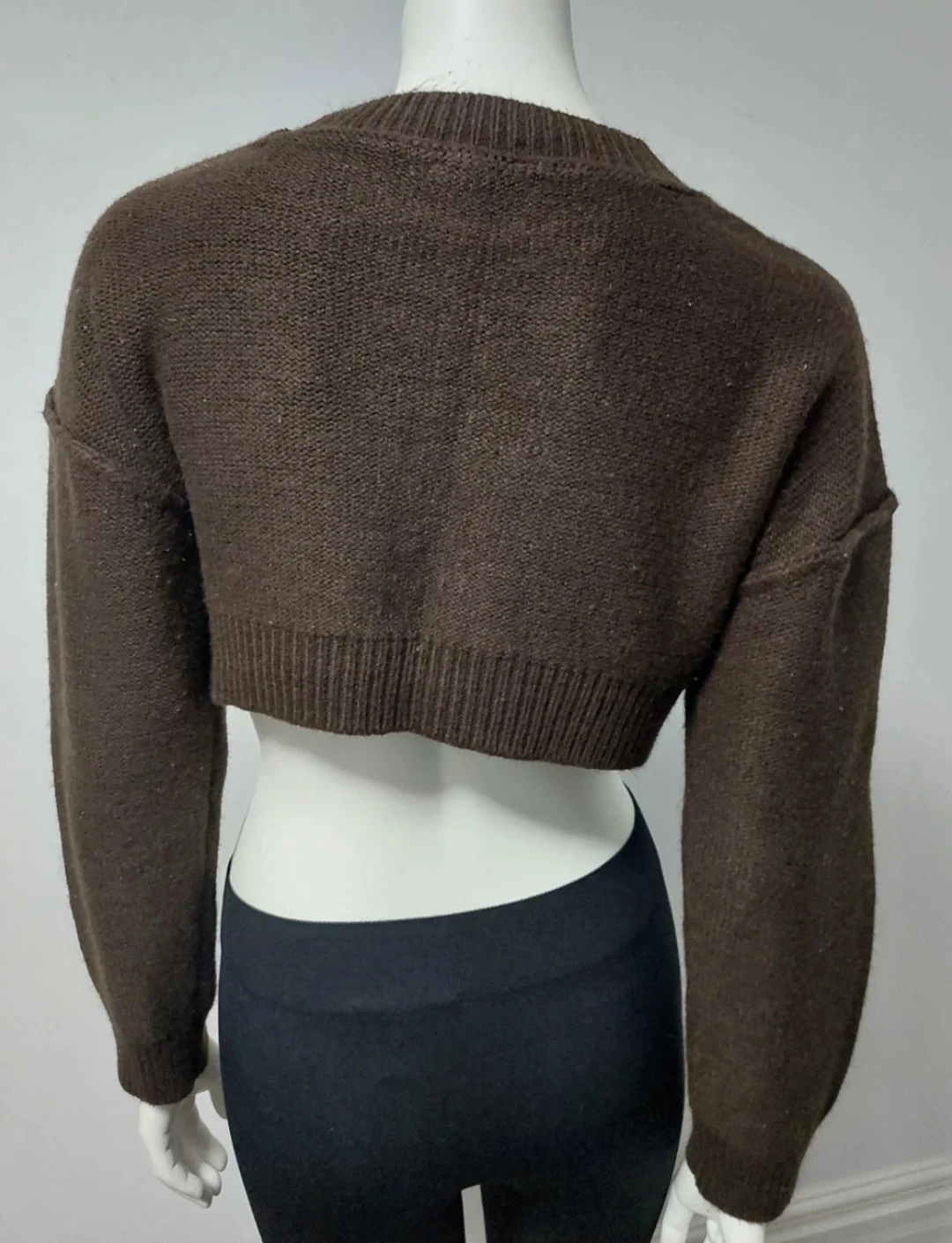 A brown cropped cardigan made from 80% acrylic and 20% cotton. It features a button-up front and a V-neckline. Size TP/XS.
