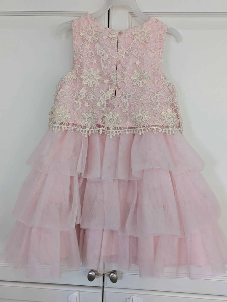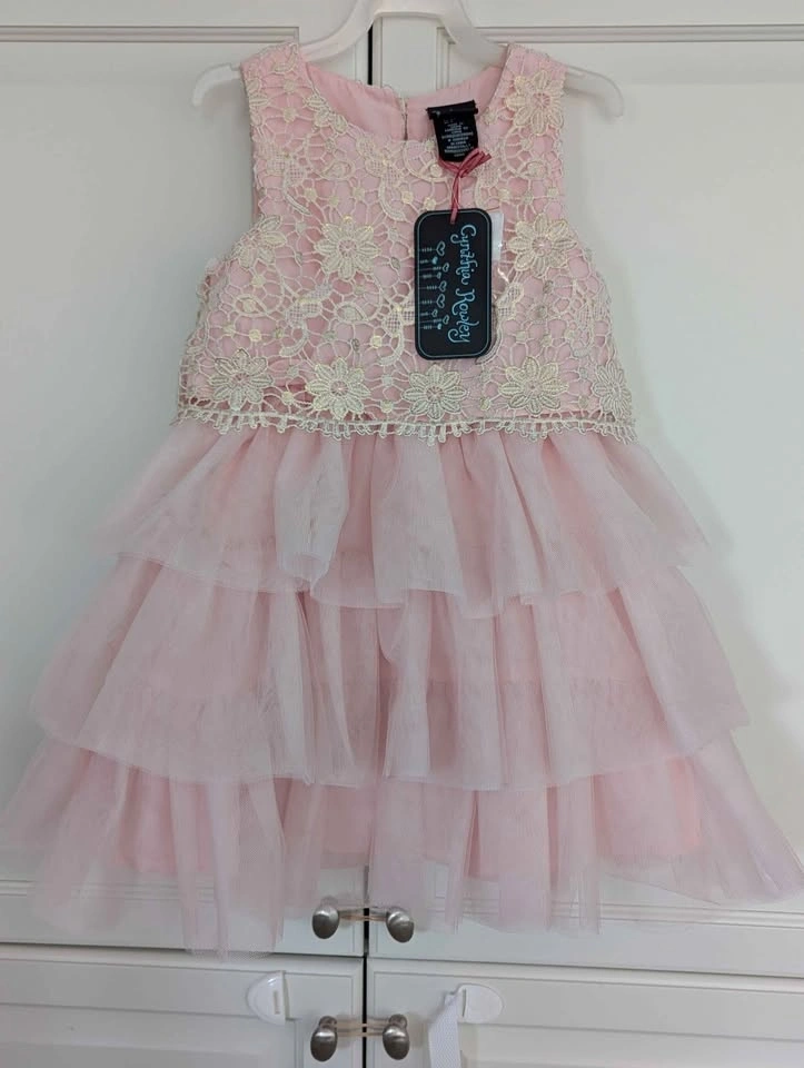 New Cynthia Rowley party dress in size 4T (tag also says 3–4 years). Features a soft pink color with a white and gold lace bodice and a tiered tulle skirt. Beautiful dress for special occasions.