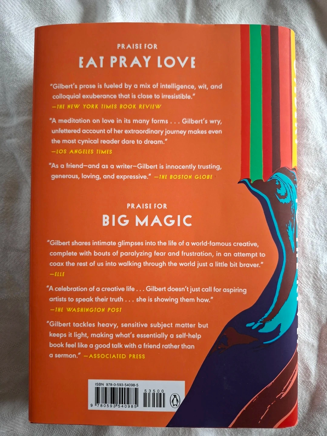This is Elizabeth Gilbert's first nonfiction book in a decade. It's a landmark memoir about love, loss, and liberation. The book's back cover describes it as a journey of self-discovery and healing.