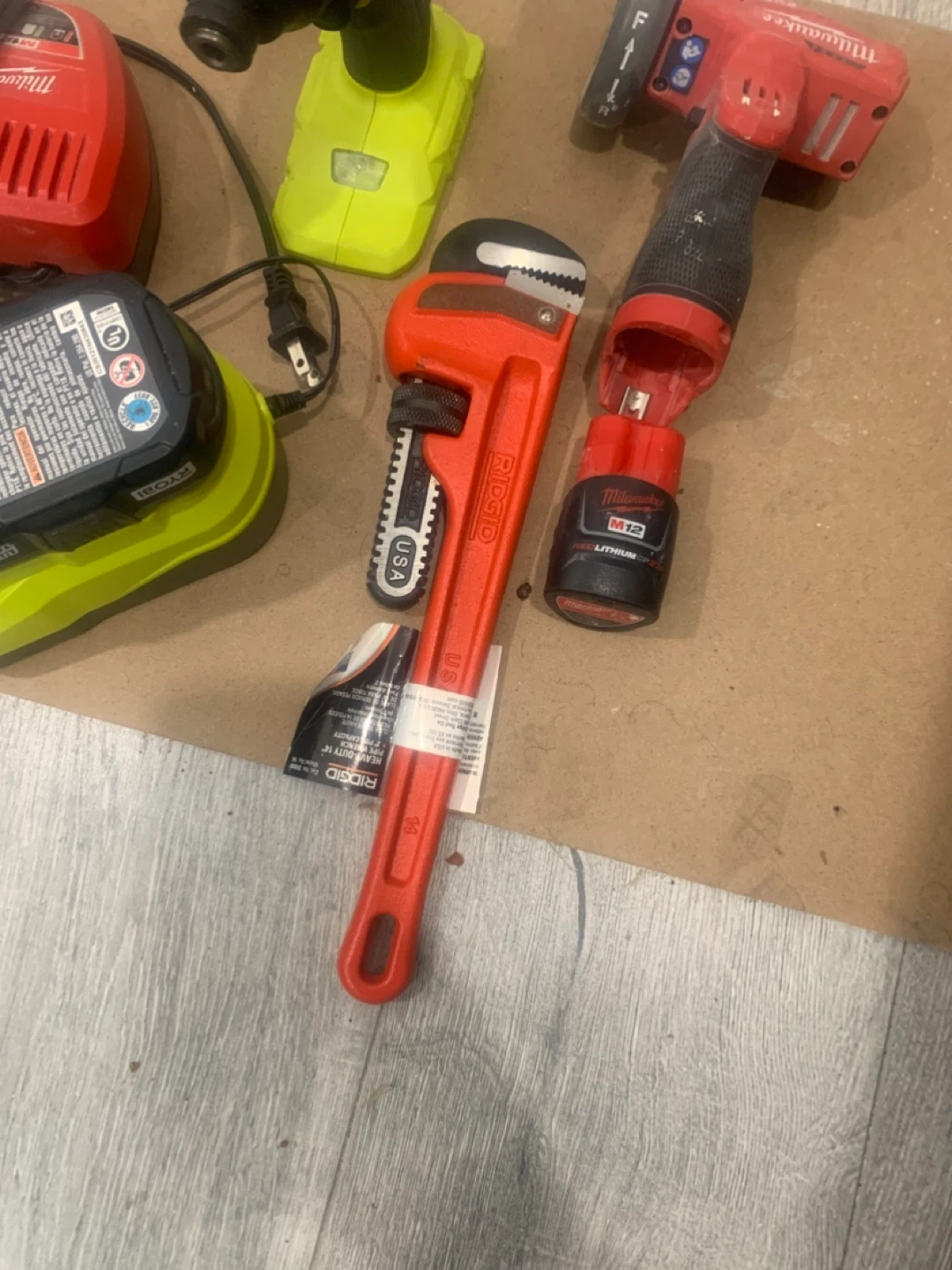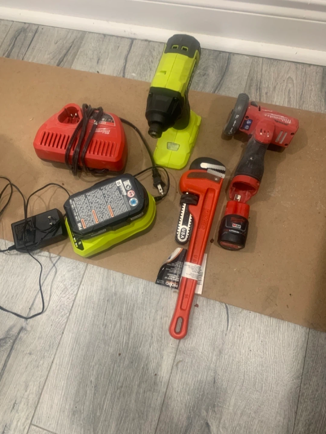 Set of four Volkswagen alloy wheels with tires. These are good for winter driving. Comes with a Ridgid pipe wrench and Milwaukee power tools.