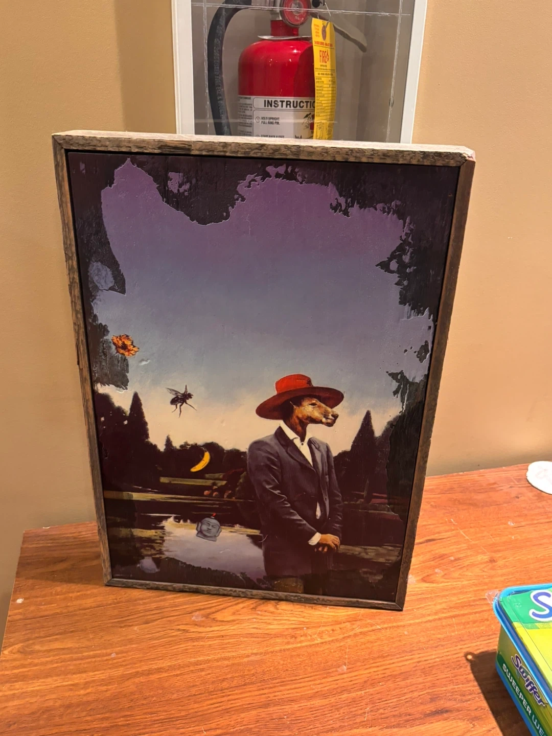 Framed artwork featuring a surreal scene with a dog character in a hat and suit. The print has a unique, dreamlike aesthetic. Wood frame included.
