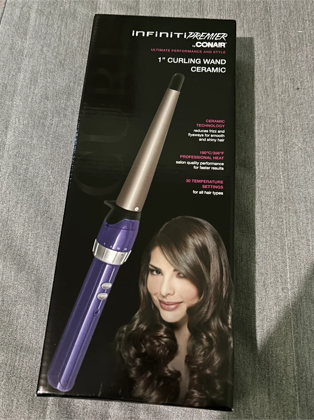 New, never opened. This Conair Infiniti Pro Premier curling wand features a 1" ceramic barrel. It's designed with ceramic technology to reduce frizz for smooth, shiny hair. It has 30 temperature settings and professional heat up to 180°C/356°F for salon quality results.
