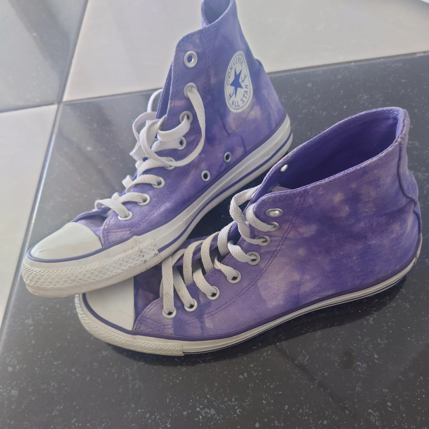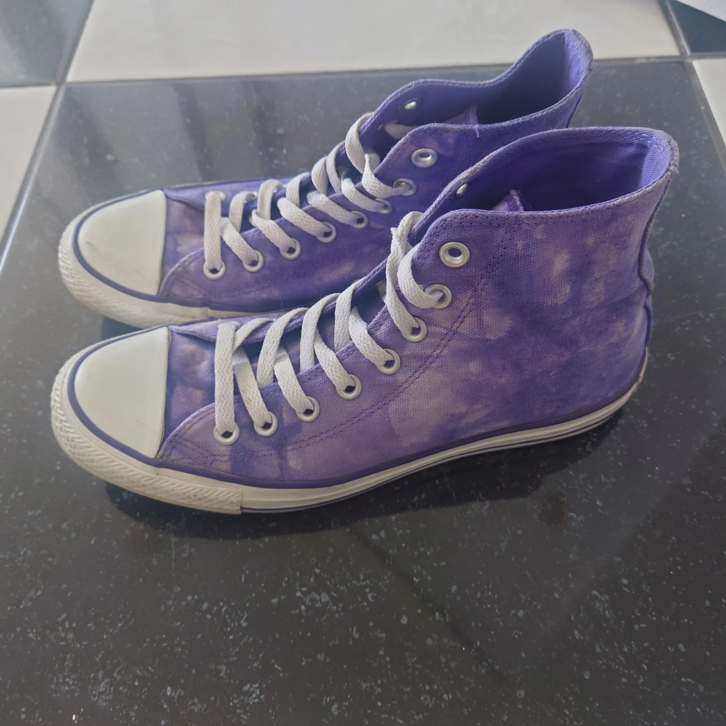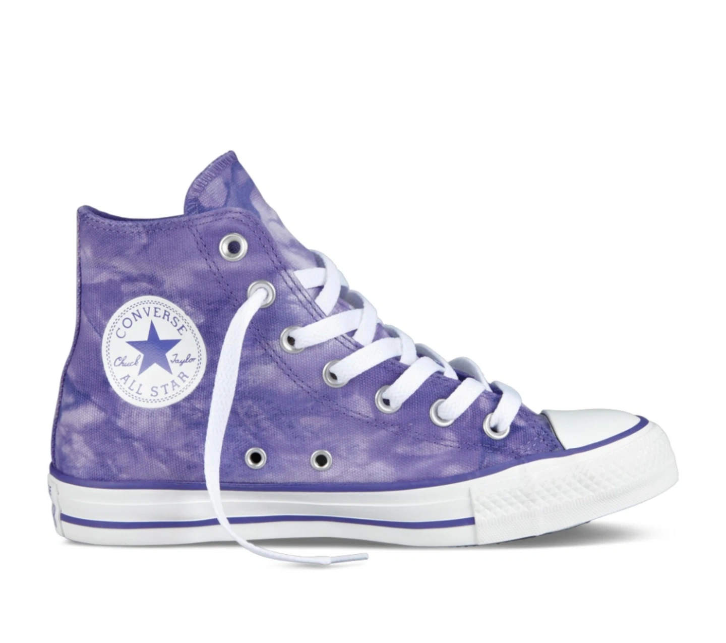 These Converse Chuck Taylor All Star high tops feature a cool purple tie-dye pattern. Canvas upper with lace-up closure. Rubber sole.