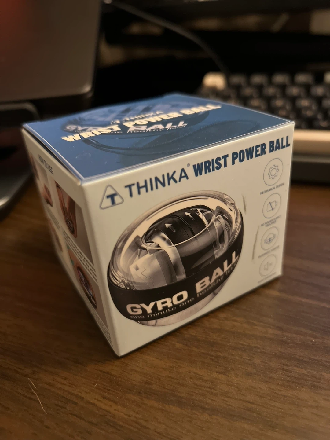 This is a THINKA Wrist Power Ball, also known as a Gyro Ball. It's designed for hand and wrist strengthening. The transparent casing shows the internal gyroscope mechanism. It's a great tool for building grip strength!