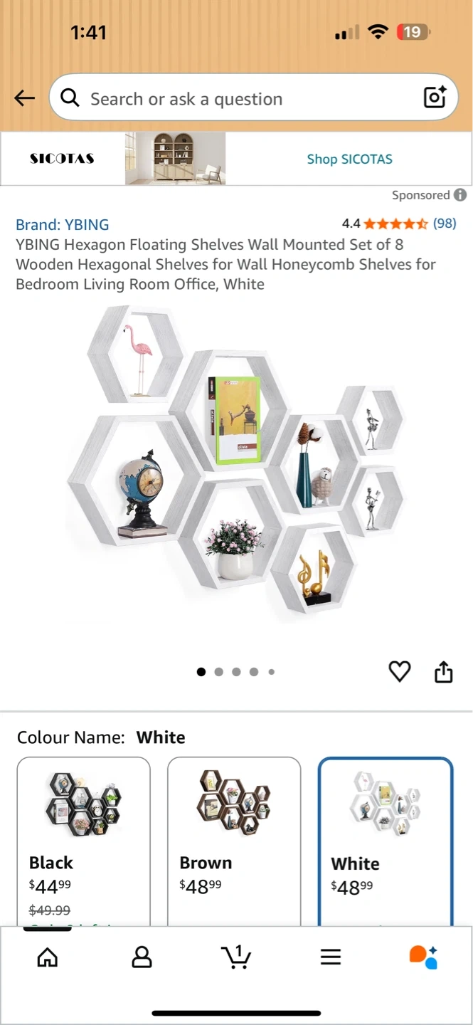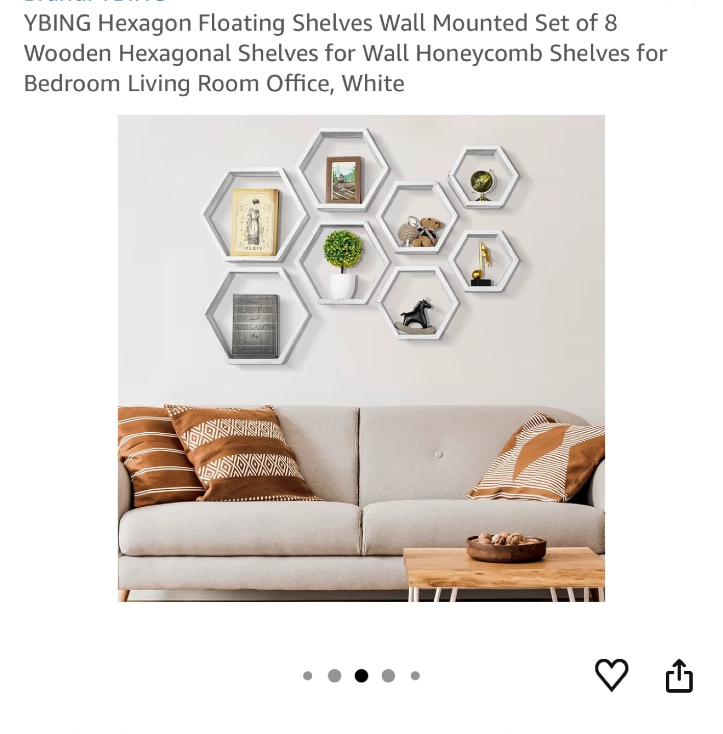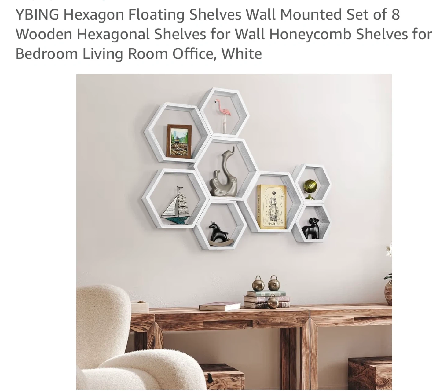 YBING Hexagon Floating Shelves - Set of 8 White Wooden
