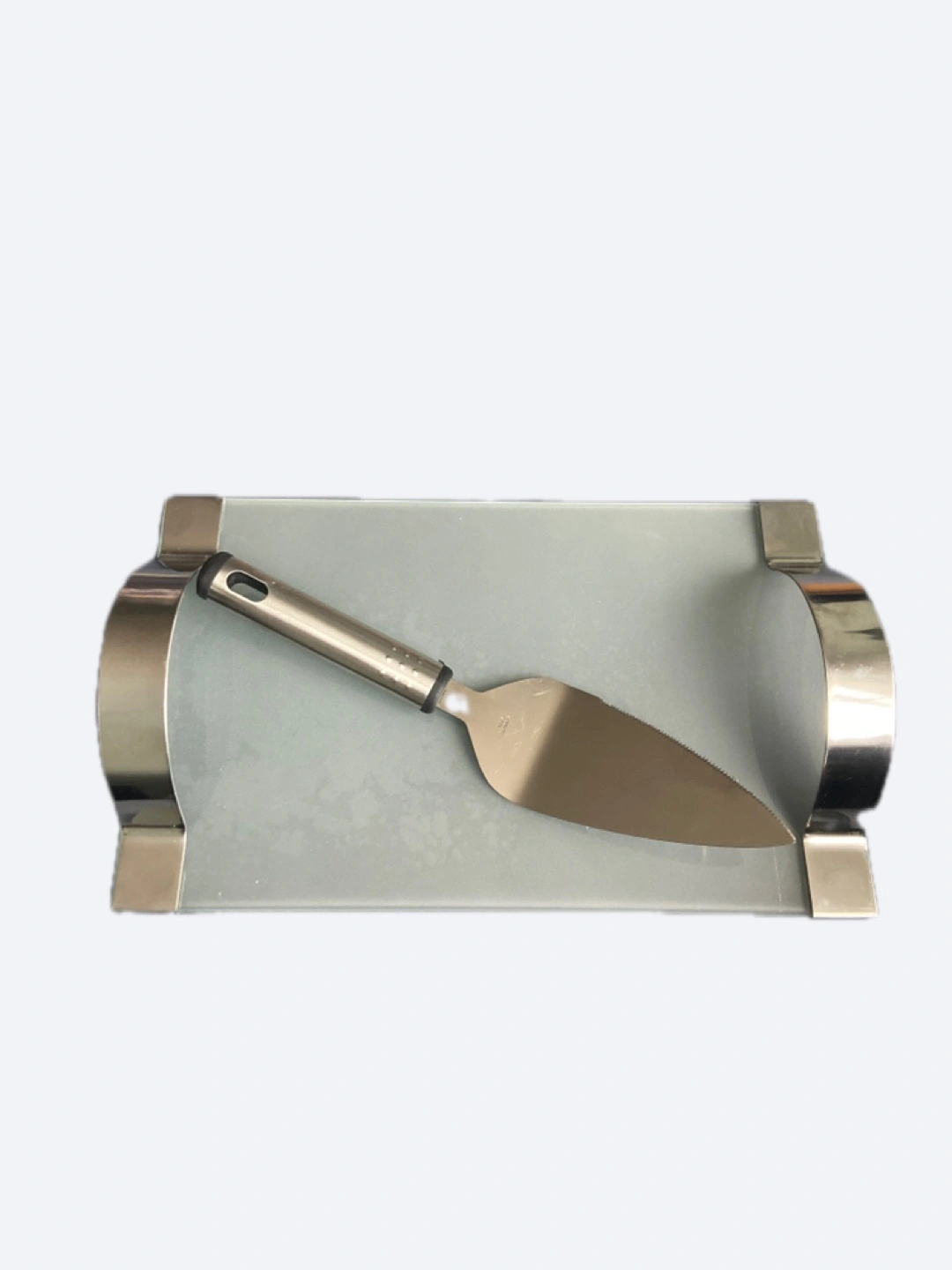 Elegant cake server and tray set. Features a frosted glass serving tray with curved metal accents. Stainless steel cake or Cheese server included. Perfect for serving desserts and Cheeses