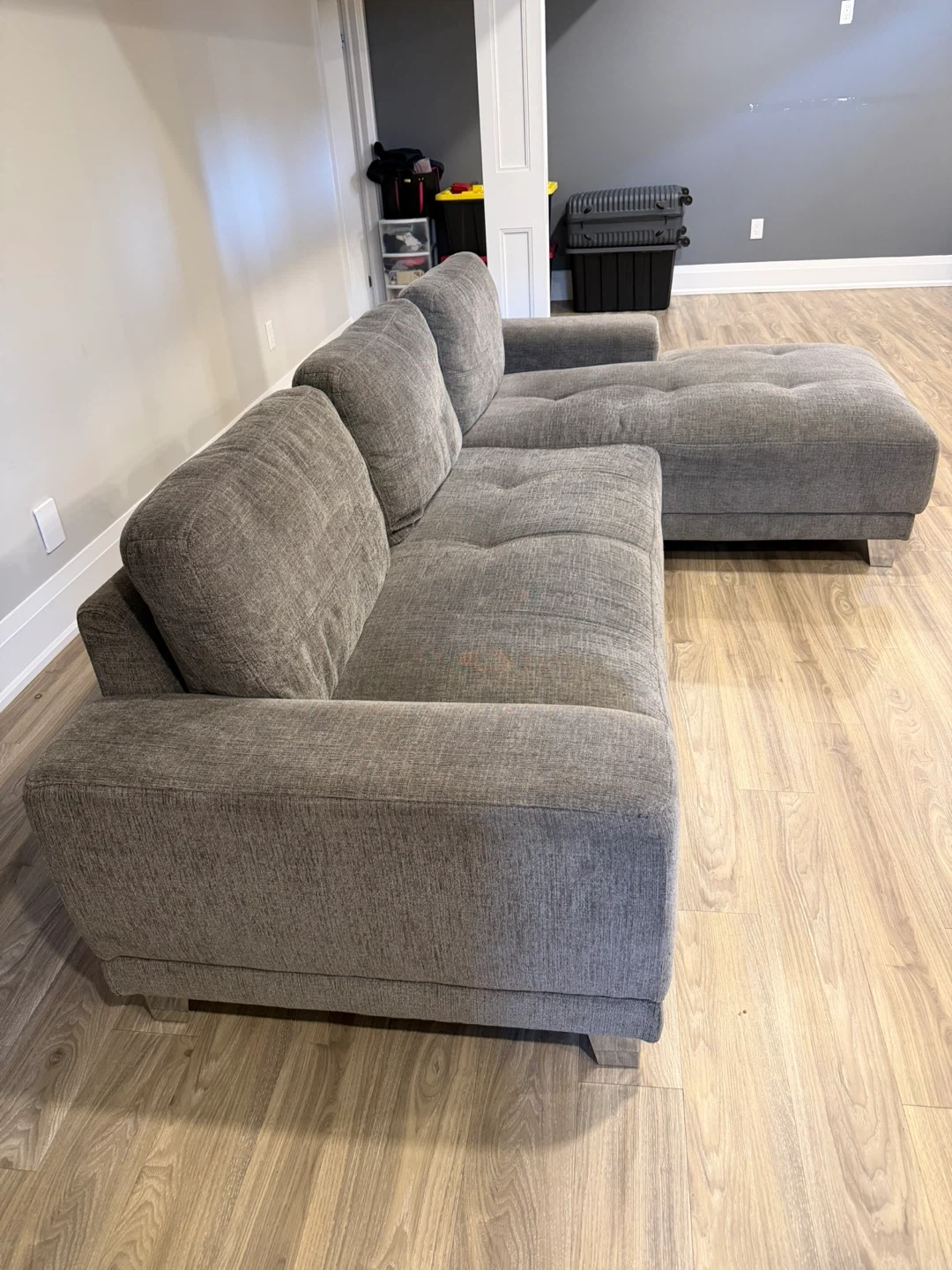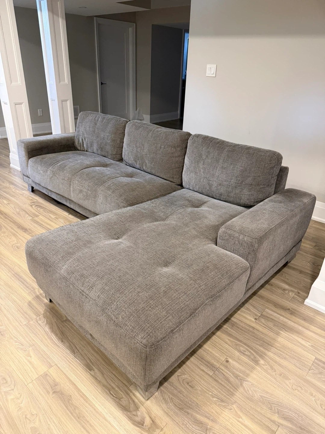 A comfortable grey sectional sofa with a chaise. It features tufted seat cushions and a modern design. This sofa would be great for lounging or entertaining!
