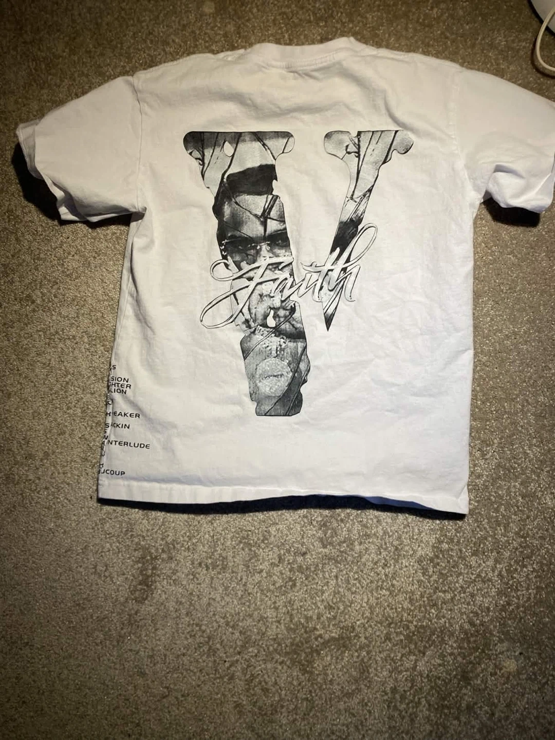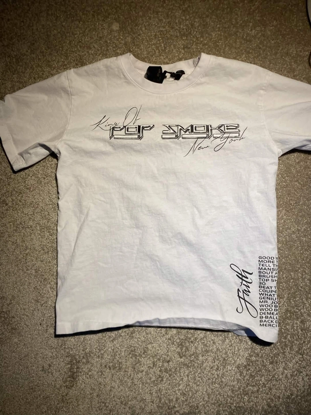 White t-shirt featuring "King of Smoke" graphic on the front and "Faith" with imagery on the back. Made of cotton.