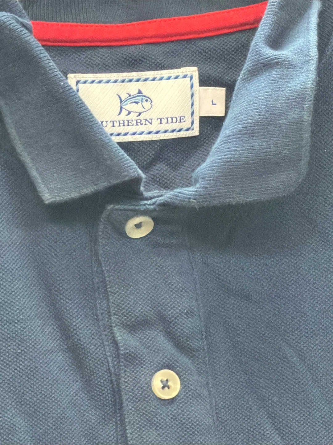 Southern Tide short-sleeve polo shirt in navy blue. Features the brand's Skipjack logo on the chest. Size L. Cotton material.