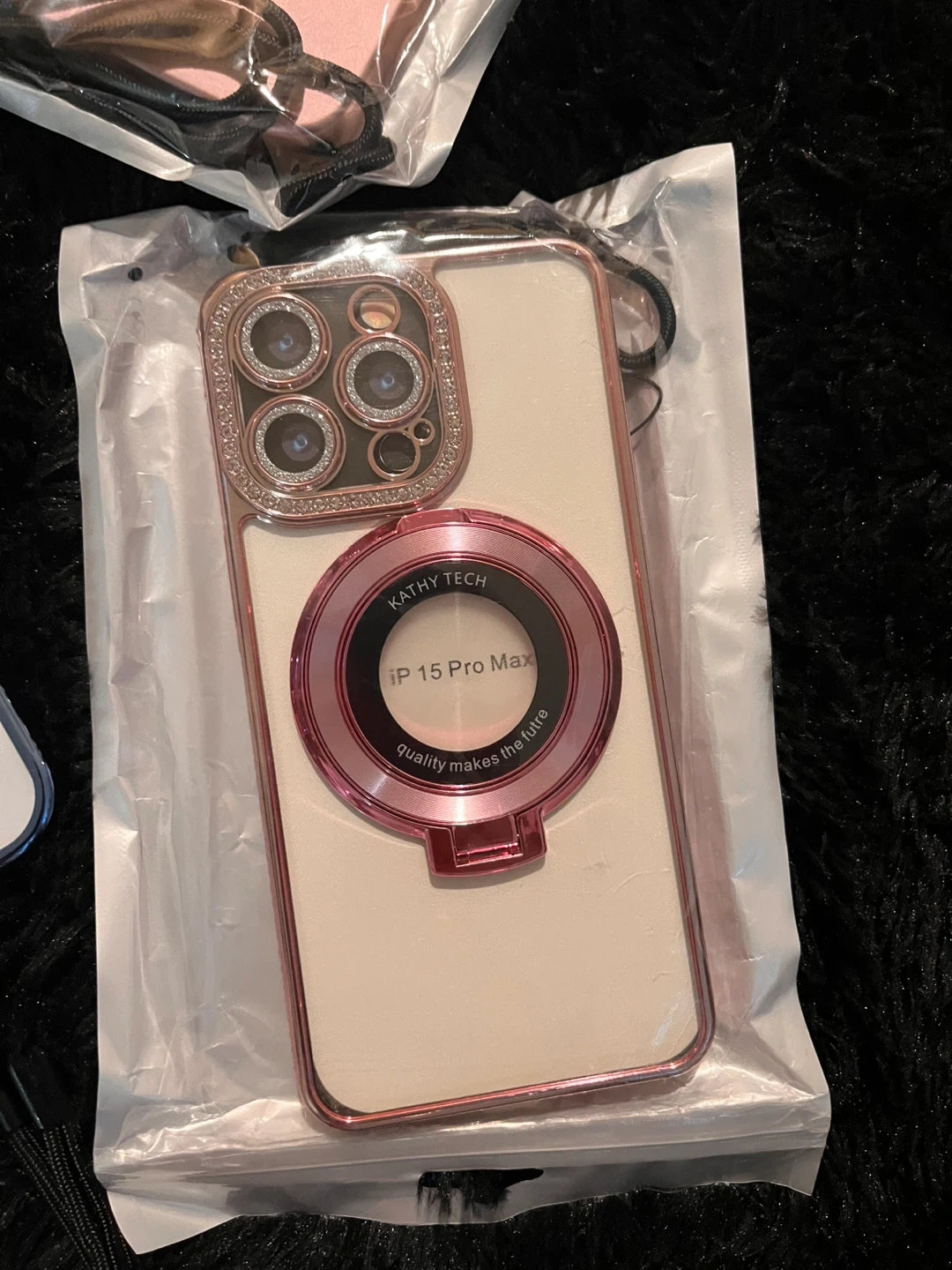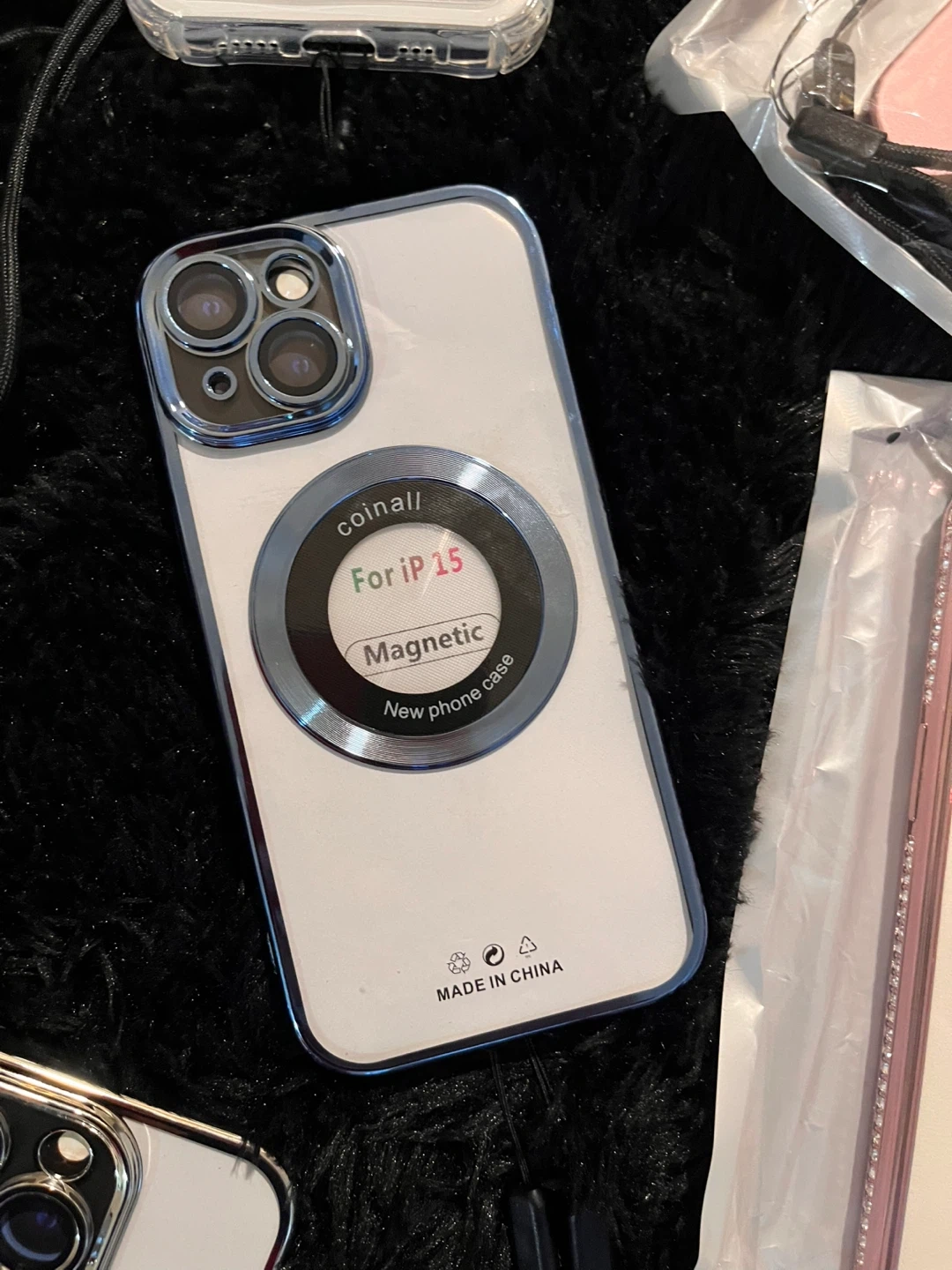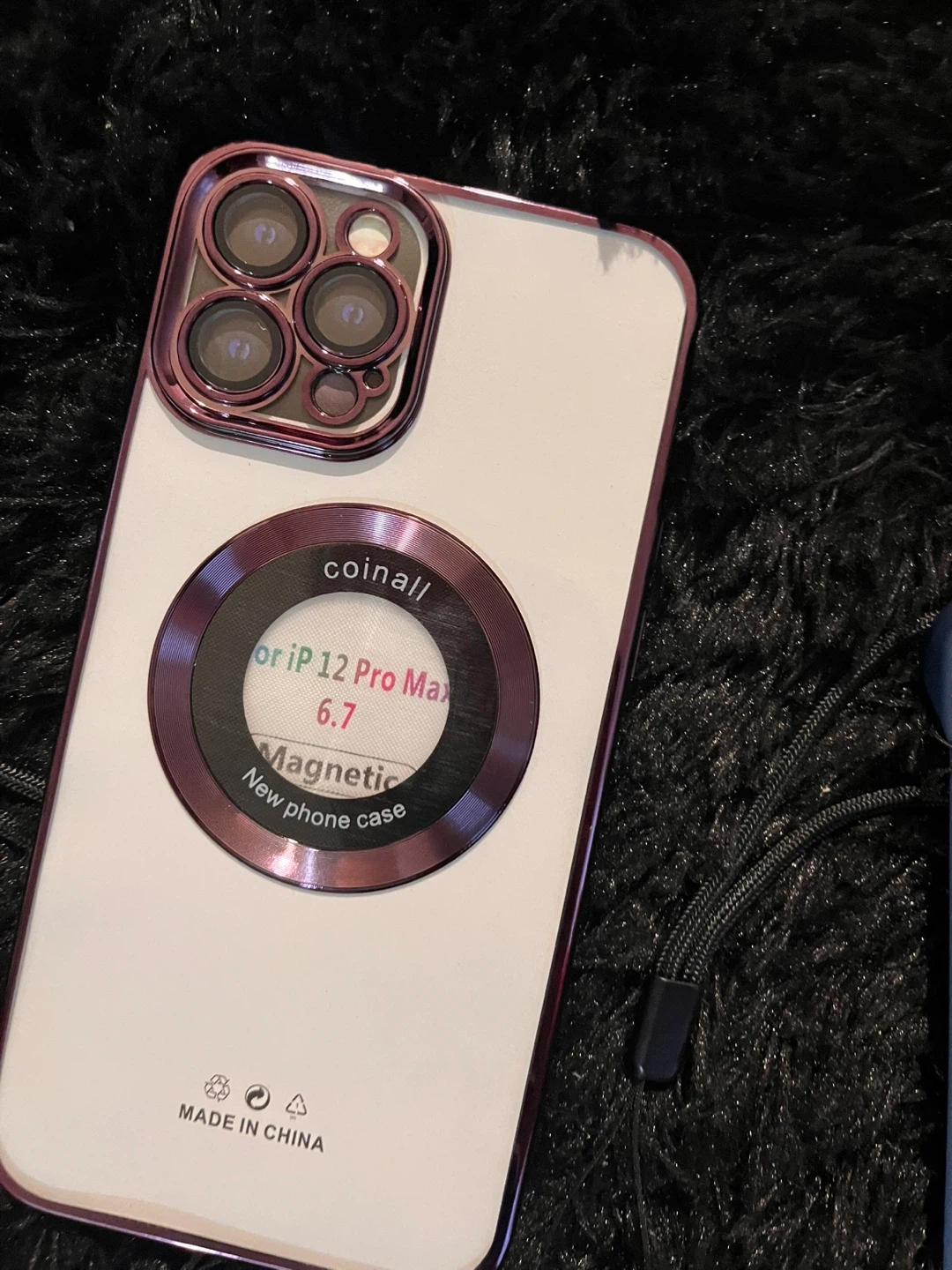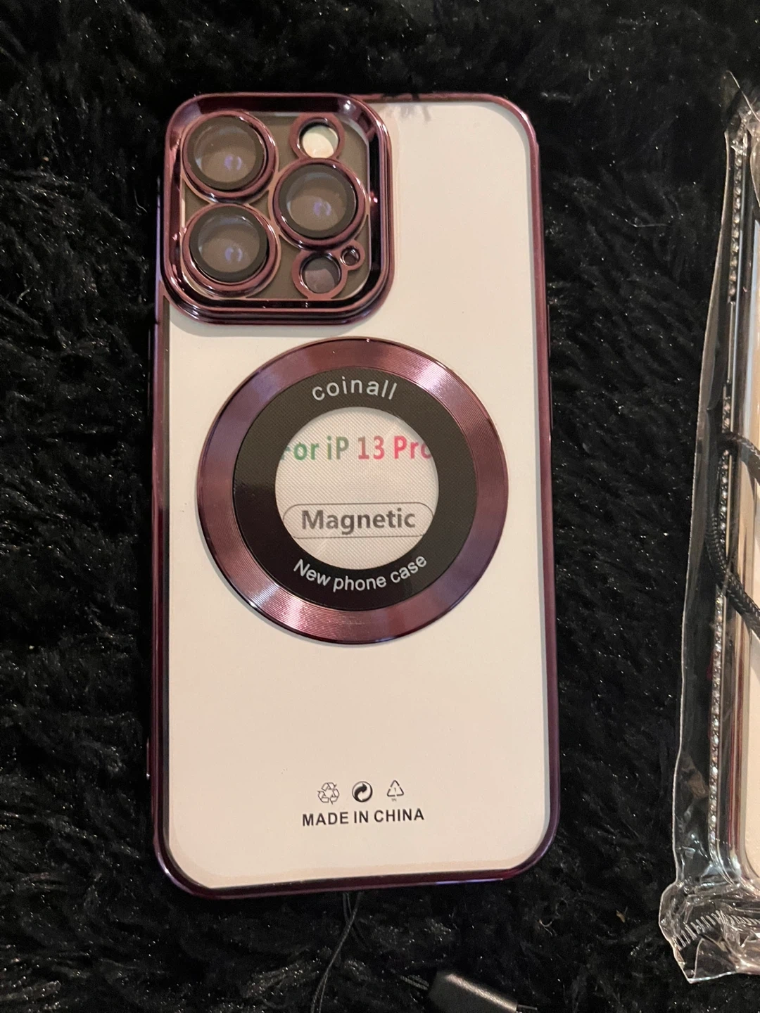 This is a new phone case designed for iPhone 13 Threw iPhone 15 Pro Max. It features a magnetic ring for added convenience and a decorative camera lens accent. It's made in China.