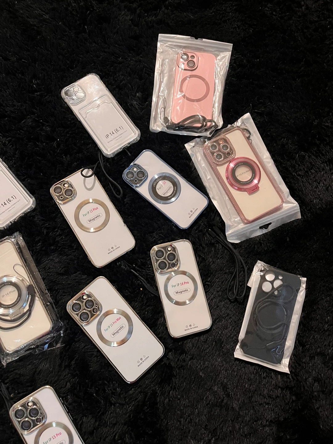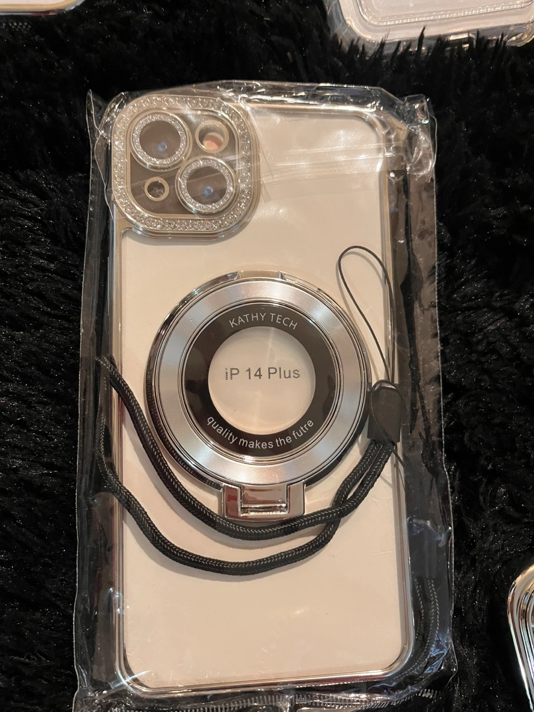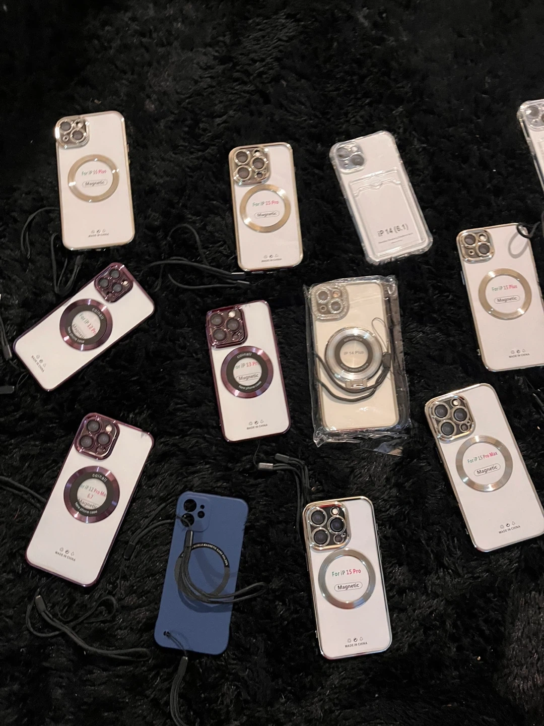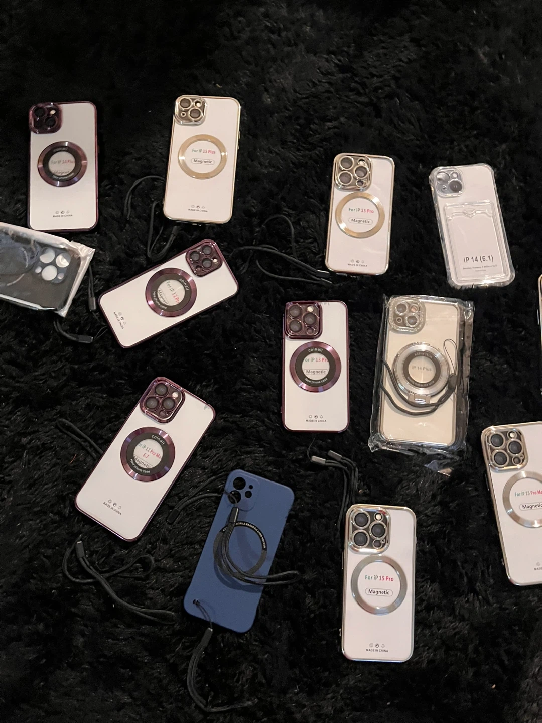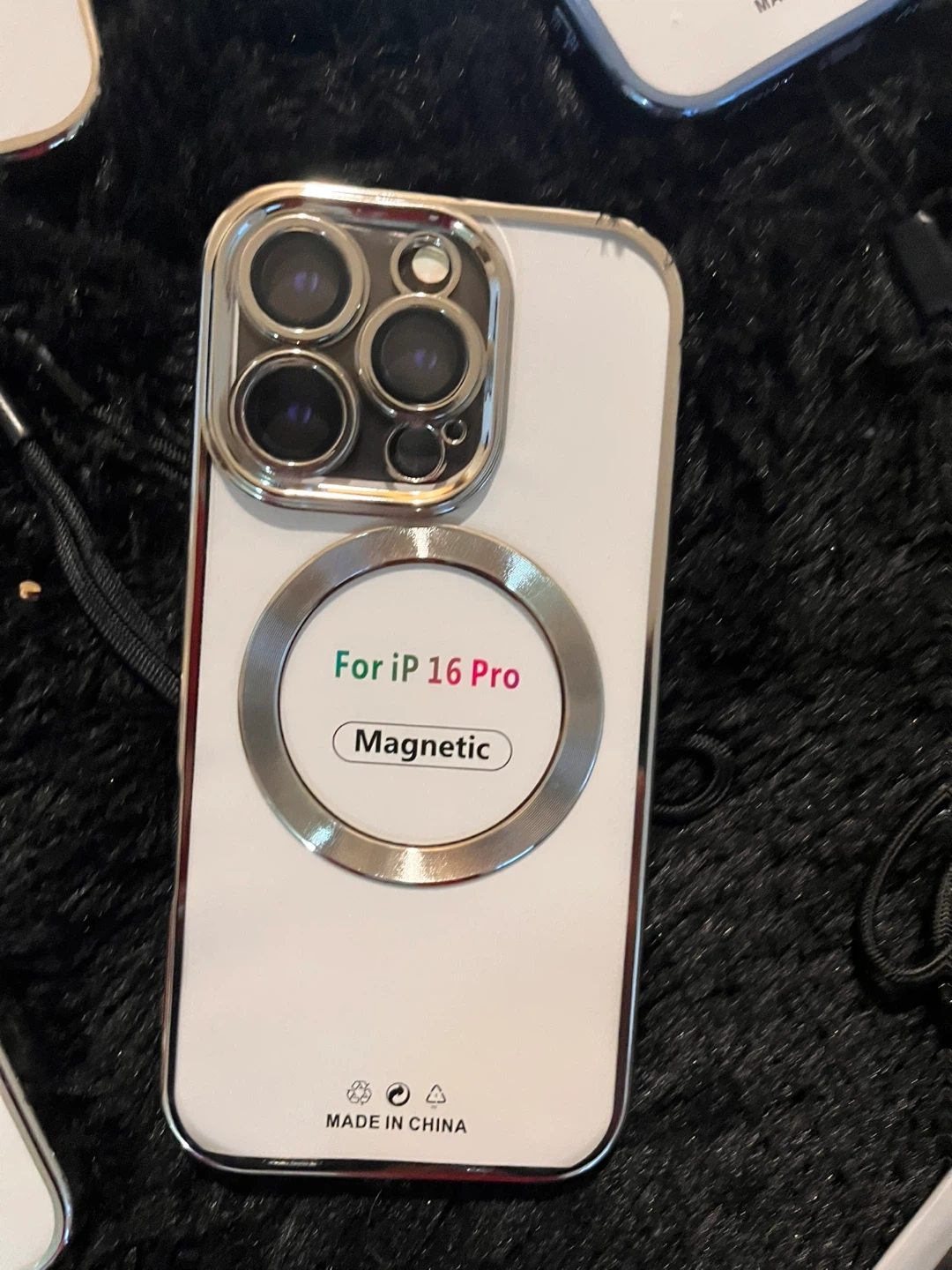 This is a new phone case designed for iPhone 13 Threw iPhone 15 Pro Max. It features a magnetic ring for added convenience and a decorative camera lens accent. It's made in China.