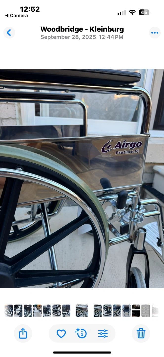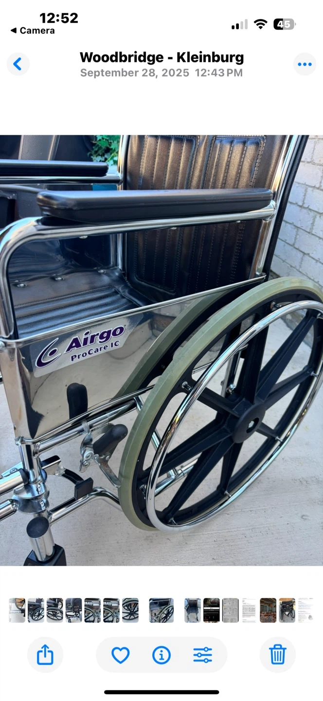 This is an Airgo ProCare IC wheelchair. It's constructed with a chrome-plated steel frame and durable upholstery. The large rear wheels offer easy maneuverability.