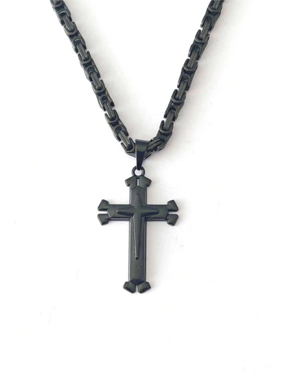A stylish black cross pendant necklace. It features a durable metal chain and a dark-finished cross. Perfect for adding a touch of edginess to any outfit!