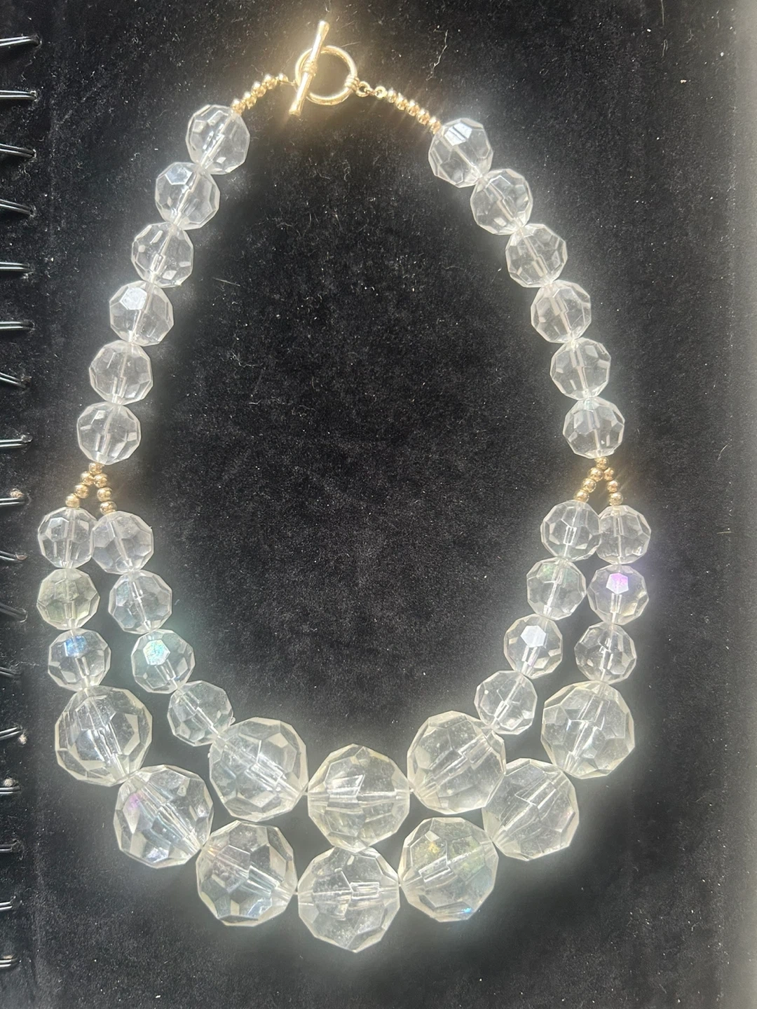 A multi-strand necklace featuring clear faceted beads. It's finished with a gold-tone toggle clasp. The beads have a subtle iridescent sheen.