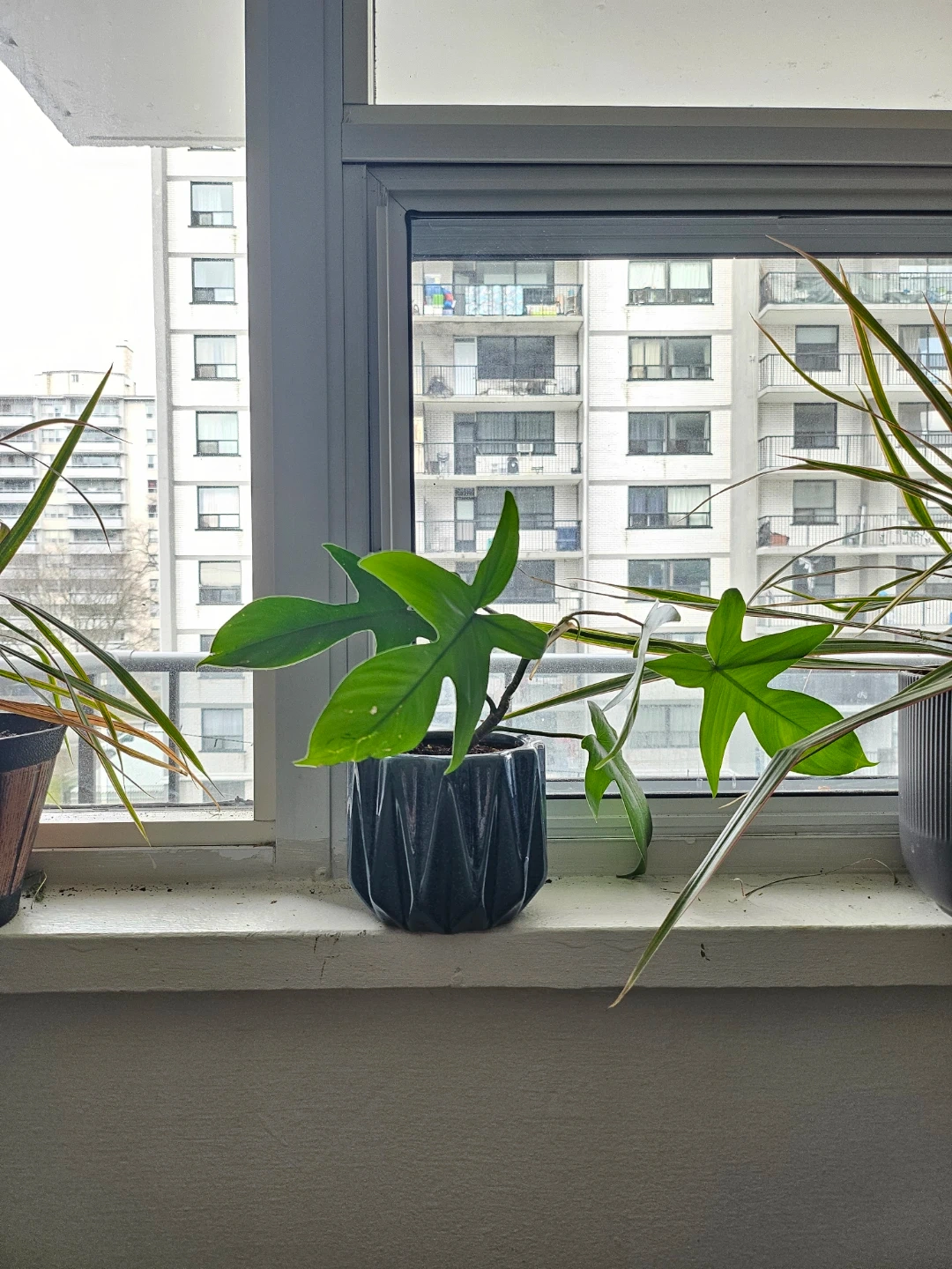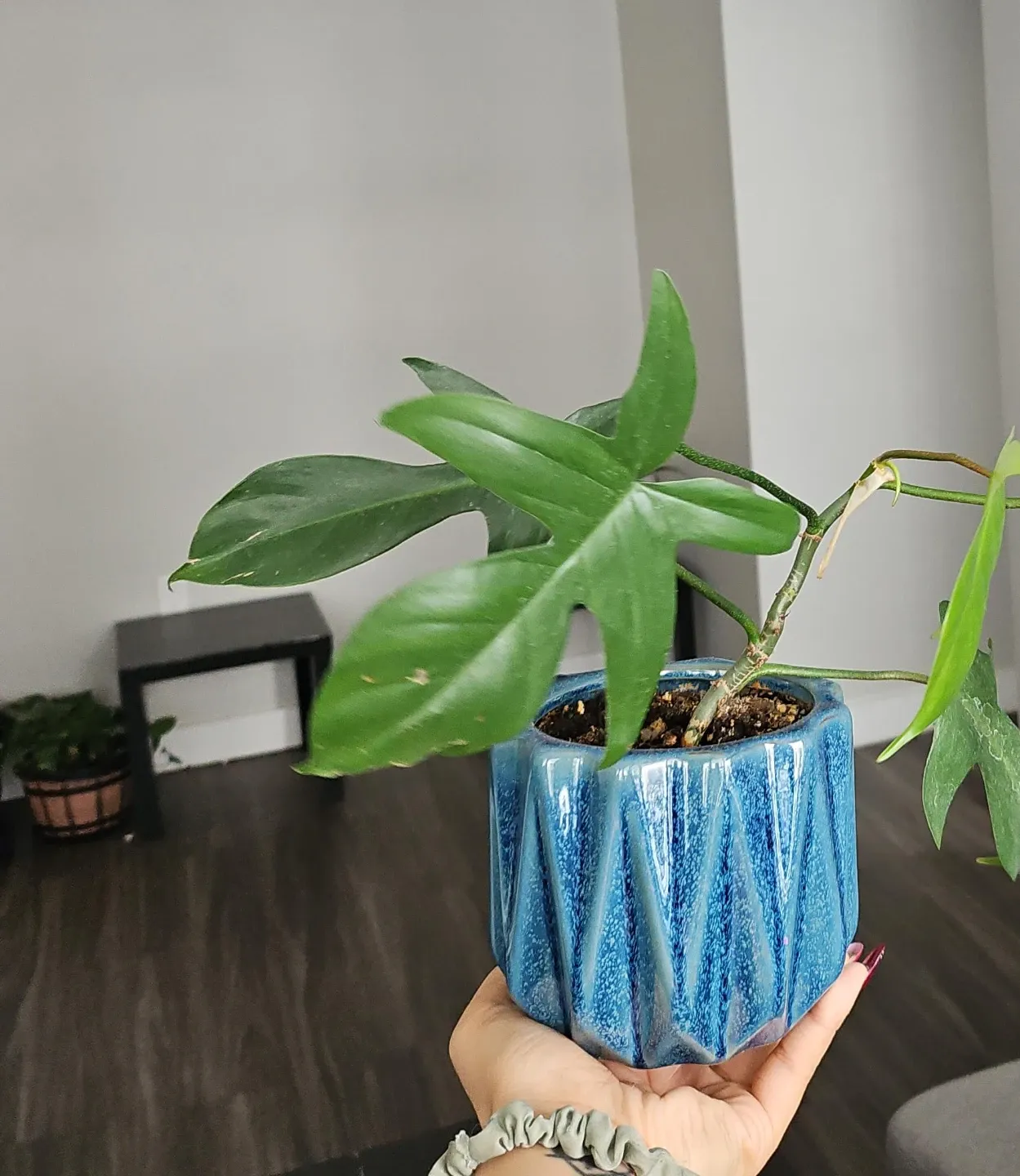 A healthy Philodendron Florida Ghost plant. It comes potted in a stylish geometric blue ceramic pot. This plant adds a lovely touch of green to any space!