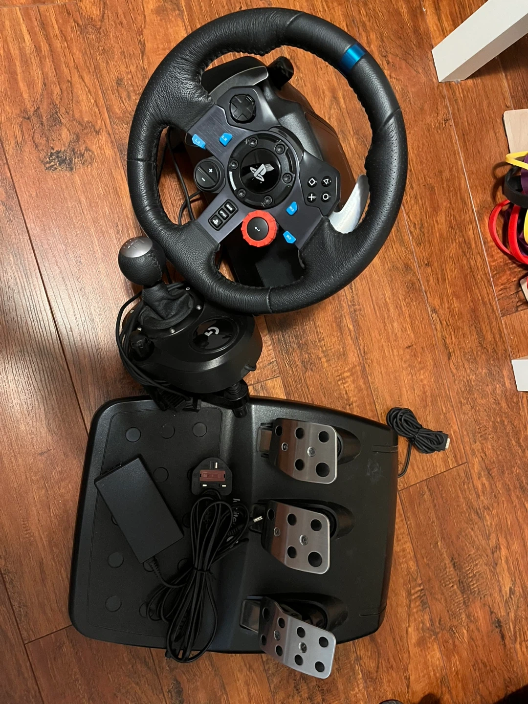 This Logitech G29 racing wheel comes with a shifter and a three-pedal set. It's designed for a realistic driving simulation experience. The set includes the wheel, shifter, pedals, and power adapter.