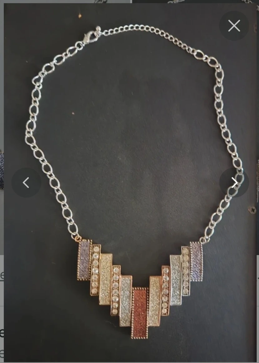 This necklace features a striking geometric design with various sparkly embellishments. It's crafted with a silver-toned chain and a V-shaped pendant. This piece adds a touch of glamour to any outfit!