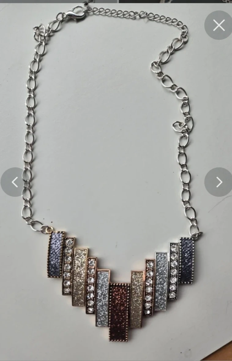 This necklace features a striking geometric design with various sparkly embellishments. It's crafted with a silver-toned chain and a V-shaped pendant. This piece adds a touch of glamour to any outfit!