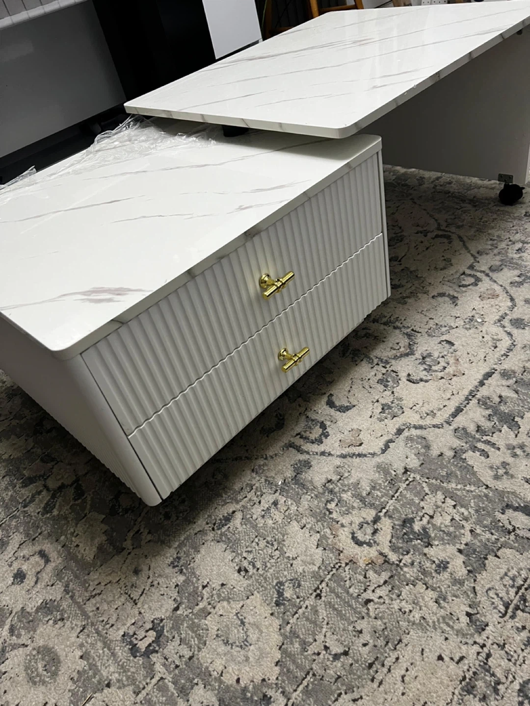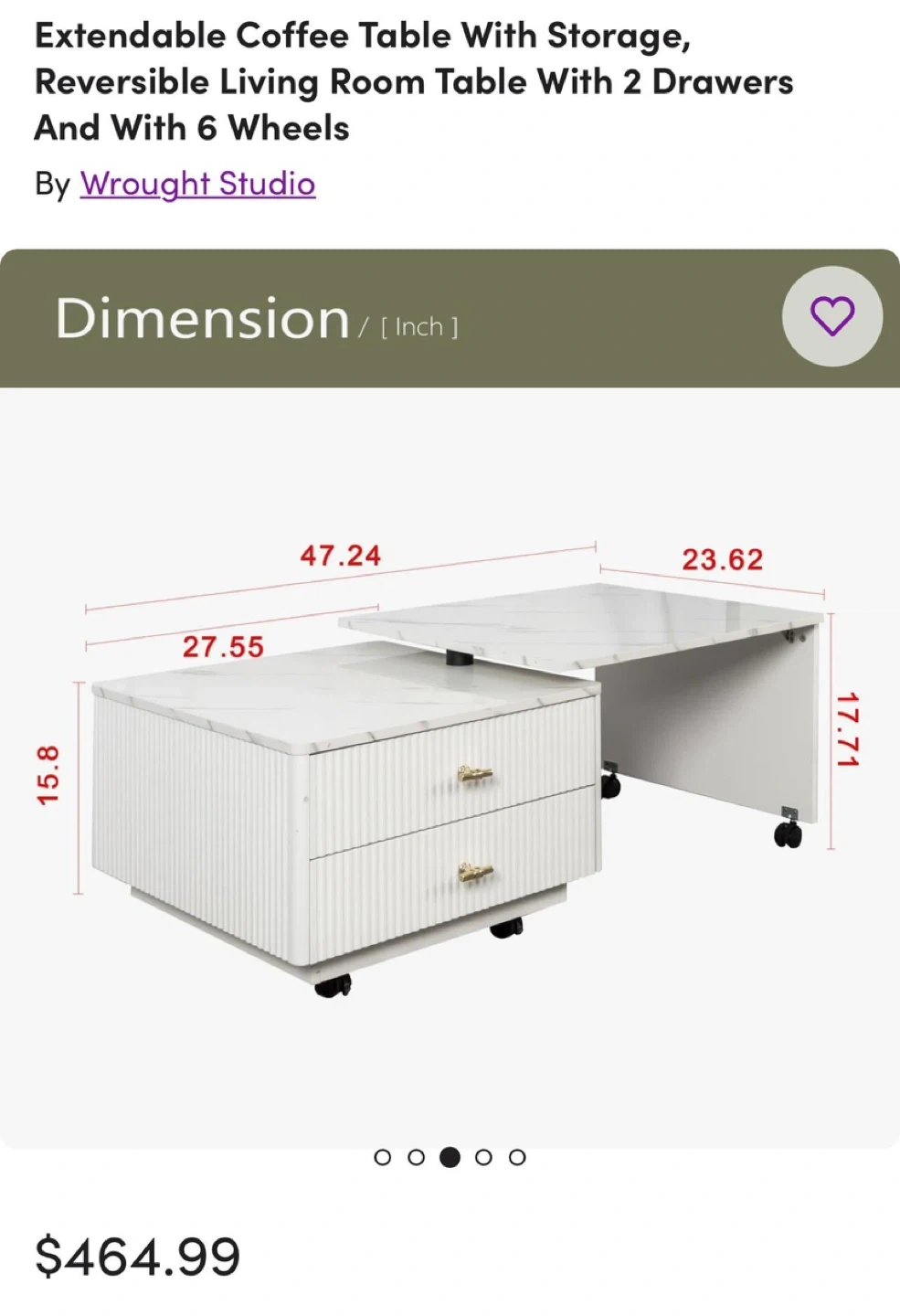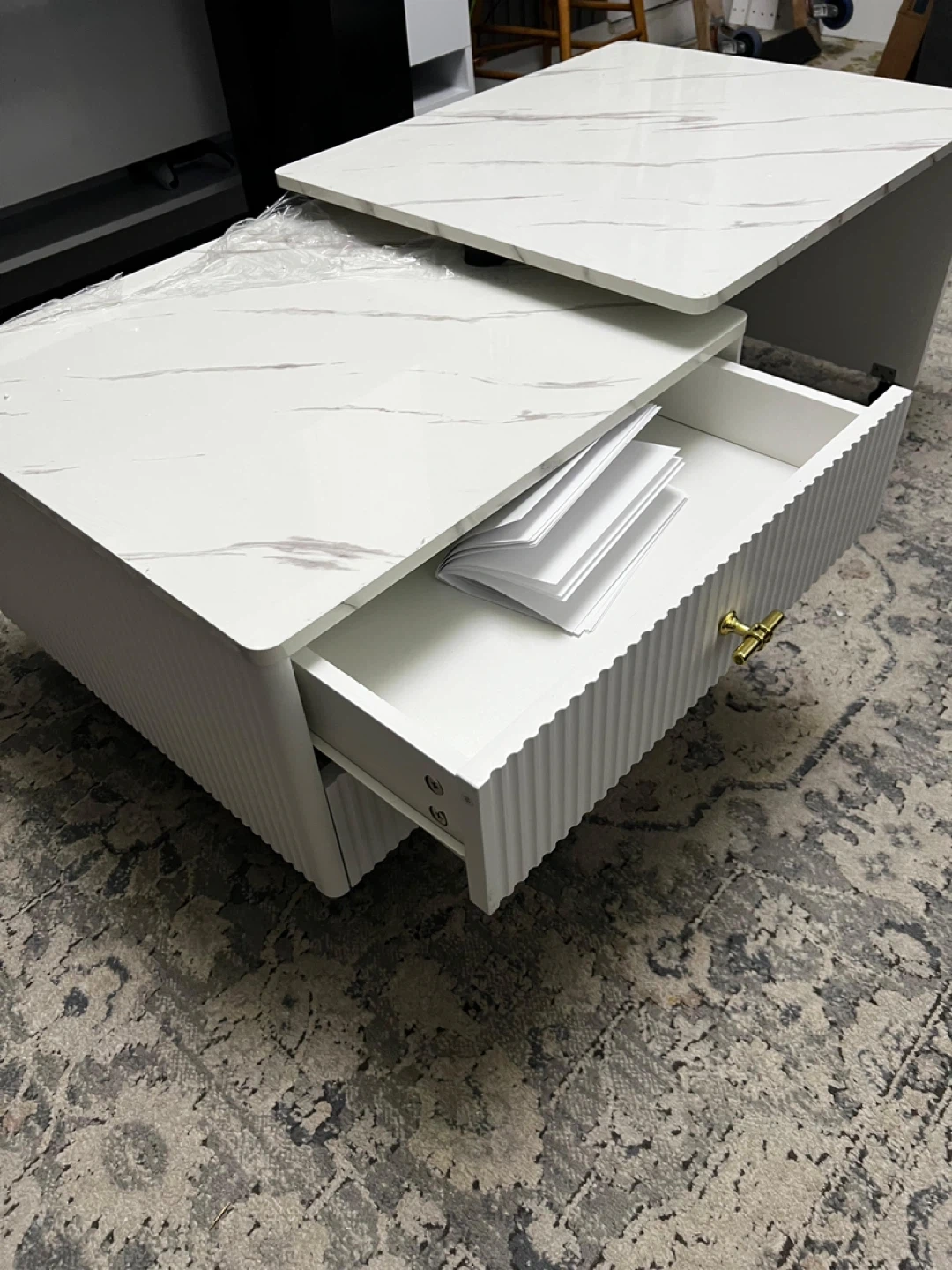This extendable coffee table offers convenient storage with two drawers. It's made with a white marble-look finish and gold hardware. The table features wheels for easy mobility.