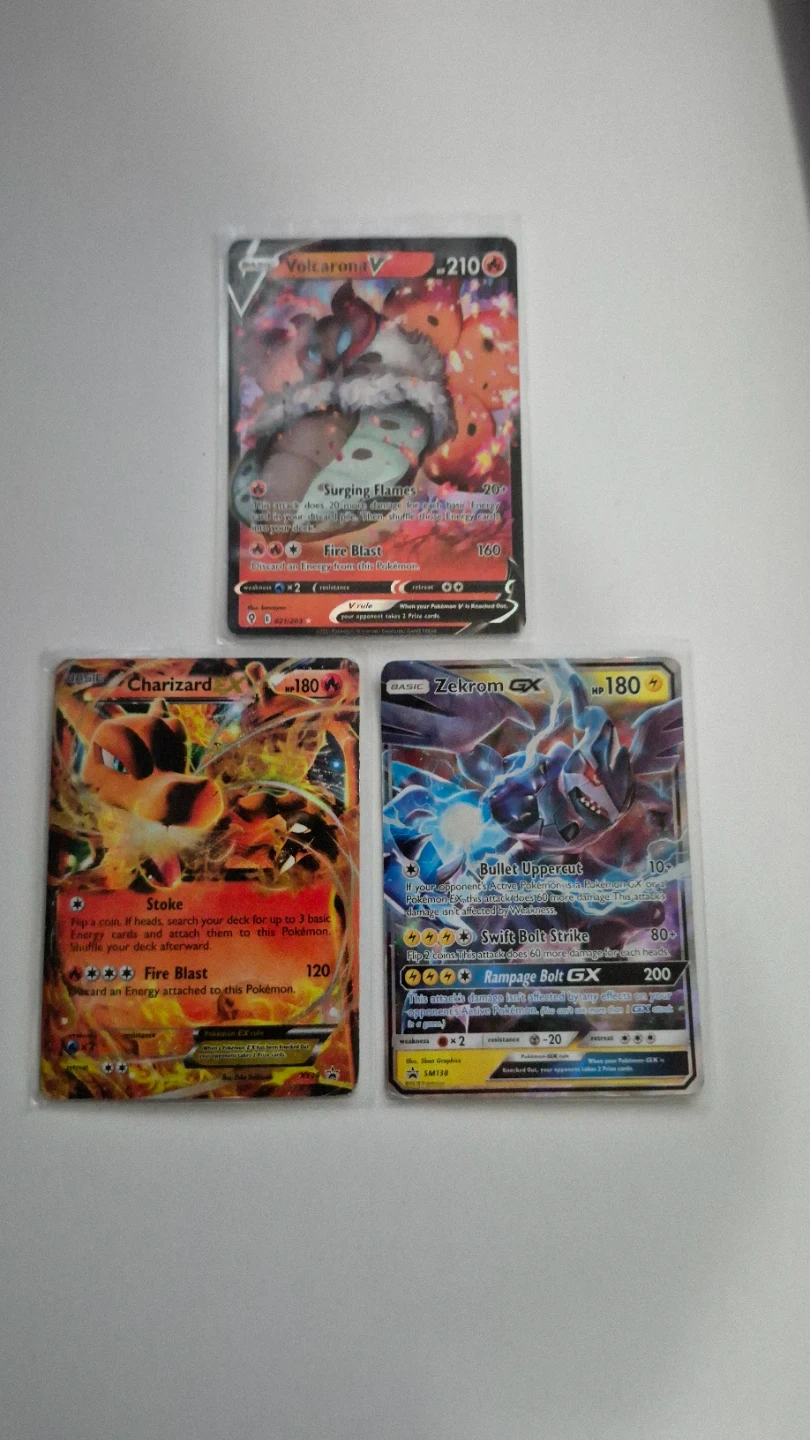 Selling a few Pokémon cards! Includes Volcarona V, Zekrom GX, and Charizard EX. Great for collectors or players!