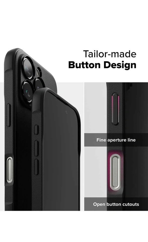 iPhone 16 Pro. Features a firm, non-slip grip, and is scratch and fingerprint resistant. Offers shockproof protection with precise camera cutouts. Color: Black.
