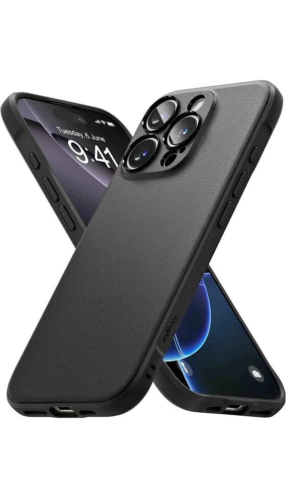 iPhone 16 Pro. Features a firm, non-slip grip, and is scratch and fingerprint resistant. Offers shockproof protection with precise camera cutouts. Color: Black.